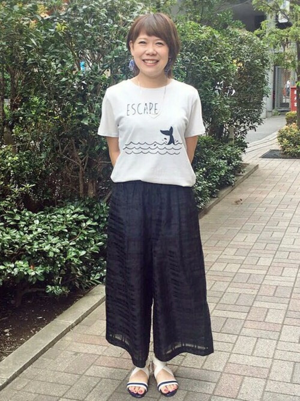 プリントTシャツを使ったコーディネート。 くじら柄がとてもキュートで夏らしいデザインになってます♪ シャドーチェック柄のガウチョパンツは程よい透け感で軽やかな雰囲気が出るのでオススメです。