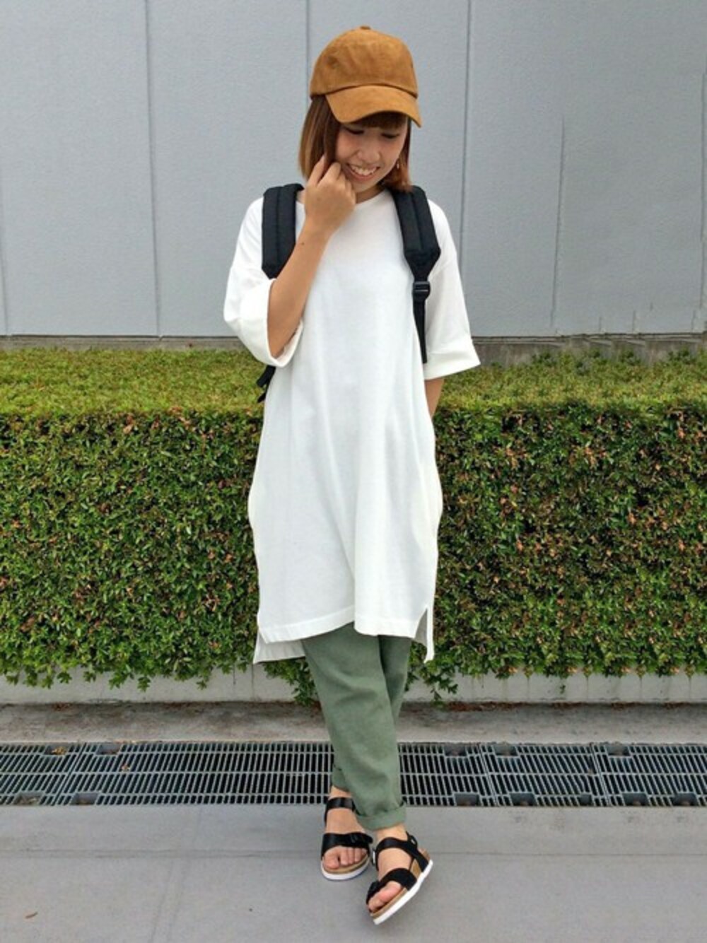 ホワイトカラーのチュニックを使ったコーディネート。 ゆったりしたシルエットで着心地◎ キャメルカラーのコーデュロイ素材のキャップをあわせ、秋を先取りしたスタイリングになってます♪