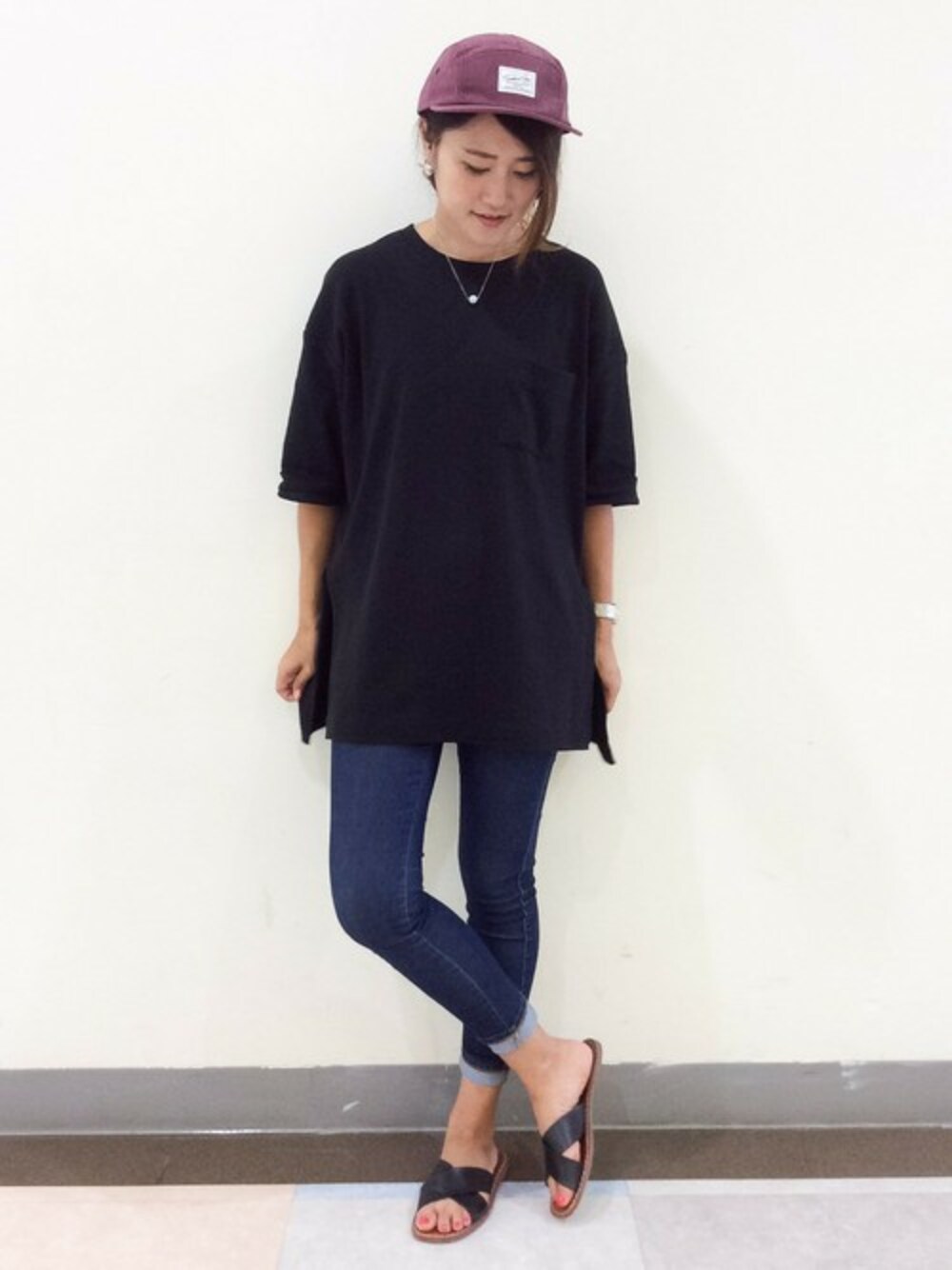 チュニック×デニムのカジュアルコーディネート。 長めのトップスと細身のパンツのバランス◎ ワインレッドのキャップをアクセントにしてみました♪