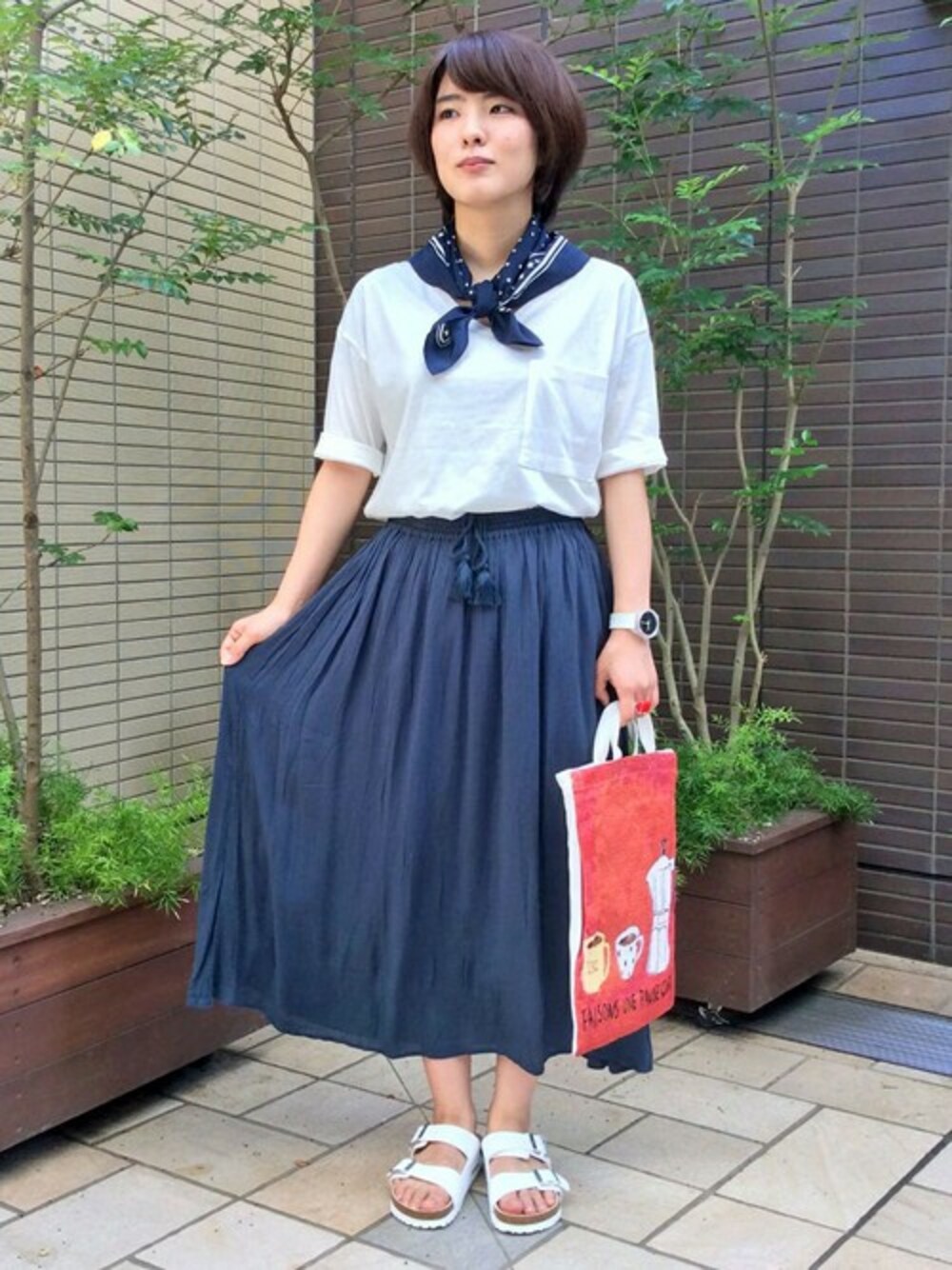 スカーフがセットになったTシャツを使ったコーディネート。 ゆったりとしたスカートを合わせラクチンなスタイルにしてみました♪ 赤色のバッグを指し色にしてアクセントつけてます。