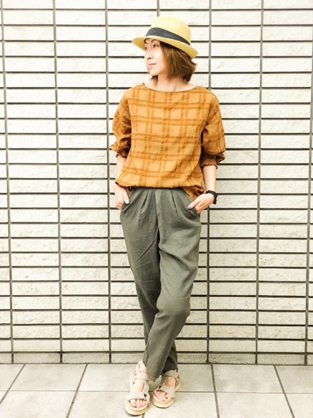 秋色ブラウスを使ったコーディネート。 同系色のチェック柄が落ち着いた大人な雰囲気で◎ 淡いカーキパンツと合わせナチュラルなカジュアルスタイルにしてみました♪
