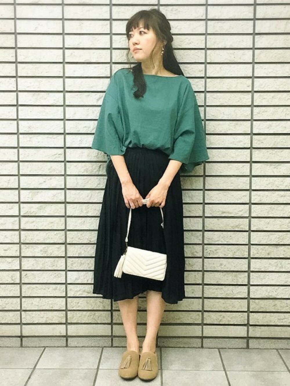 上品なグリーンカラーのブラウスを使ったコーディネート。 袖が大きめなフレアで女性らしさ◎ プリーツスカートを合わせキレイめカジュアルなスタイルにしてみました♪