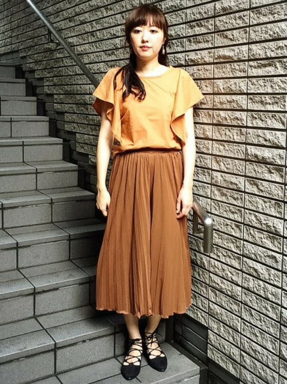 今年トレンドのテラコッタカラーを使ったコーディネート。 大きめフリル袖のトップスとプリーツスカートを合わせ女性らしさ◎ レースアップシューズで上品さをプラスしました。