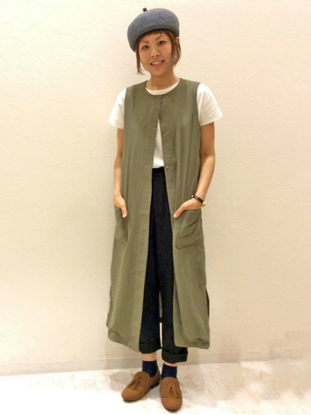 ロング丈のジレを使ったコーディネート。 カーキカラーをメインにホワイト×ブラックで合わせバランス◎ ベレー帽やブラウンのシューズで秋らしさもプラスしてみました。
