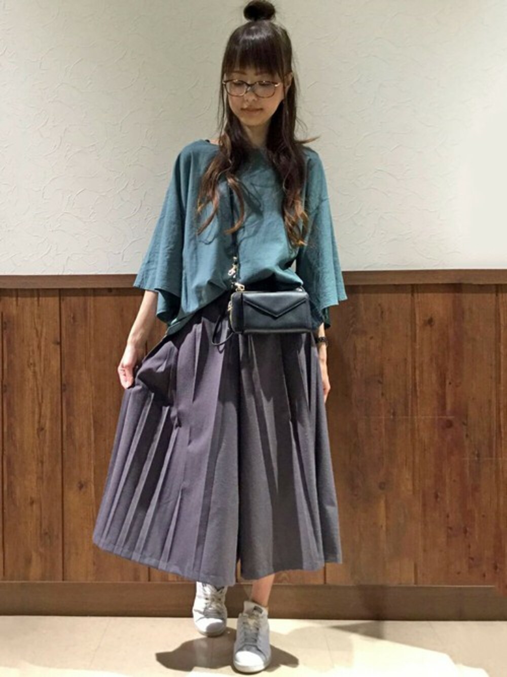 袖フレアブラウスを使ったコーディネート。 スカウチョと合わせふんわり緩やかなスタイリングにしてみました♪ スニーカーでカジュアルさをプラスしてお出かけにもオススメです。