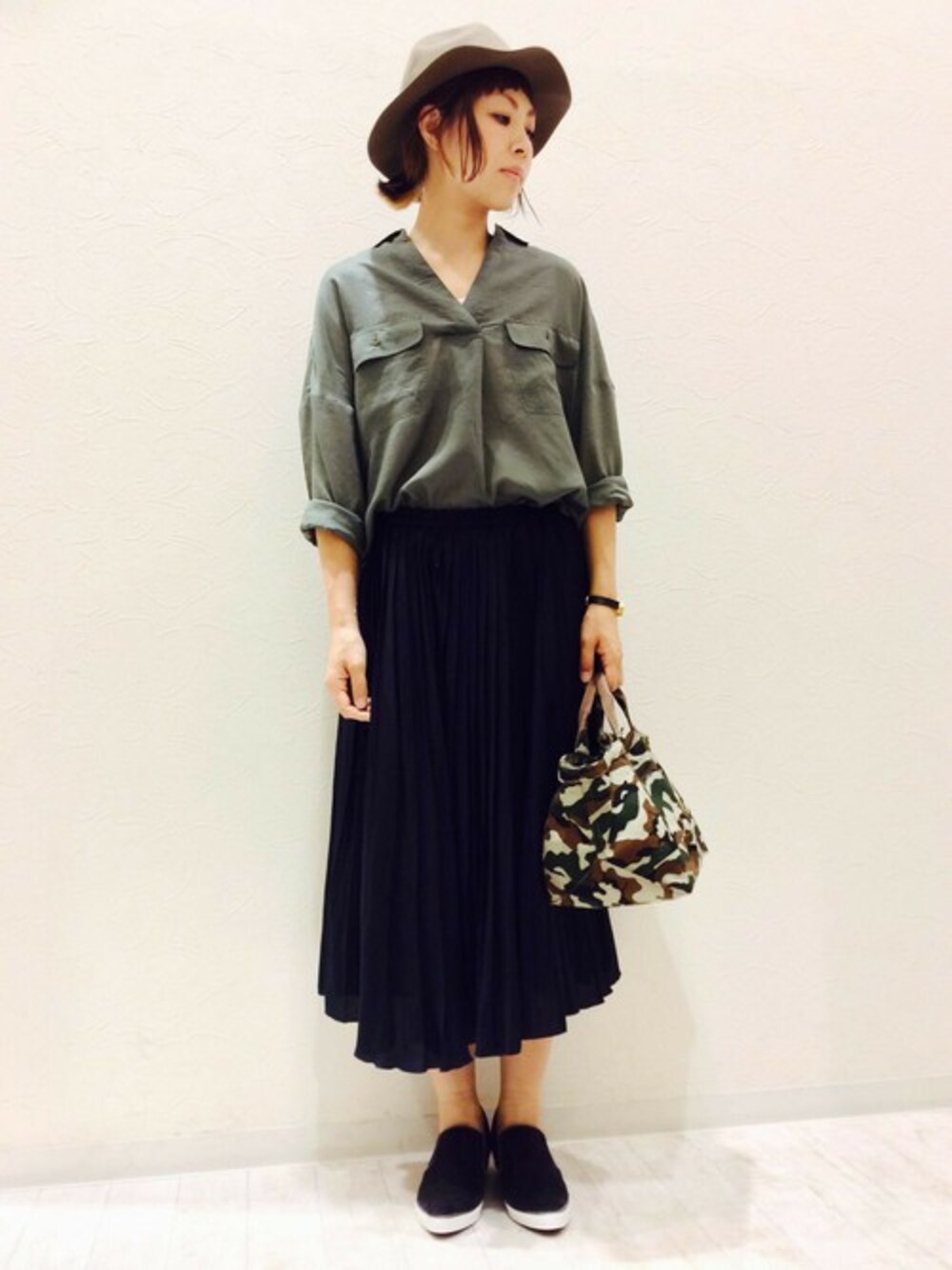スキッパーブラウスを使ったコーディネート。 テンセル素材で上品な光沢と肌触り◎ カーキ×ネイビーで落ち着いた雰囲気にしてみました♪