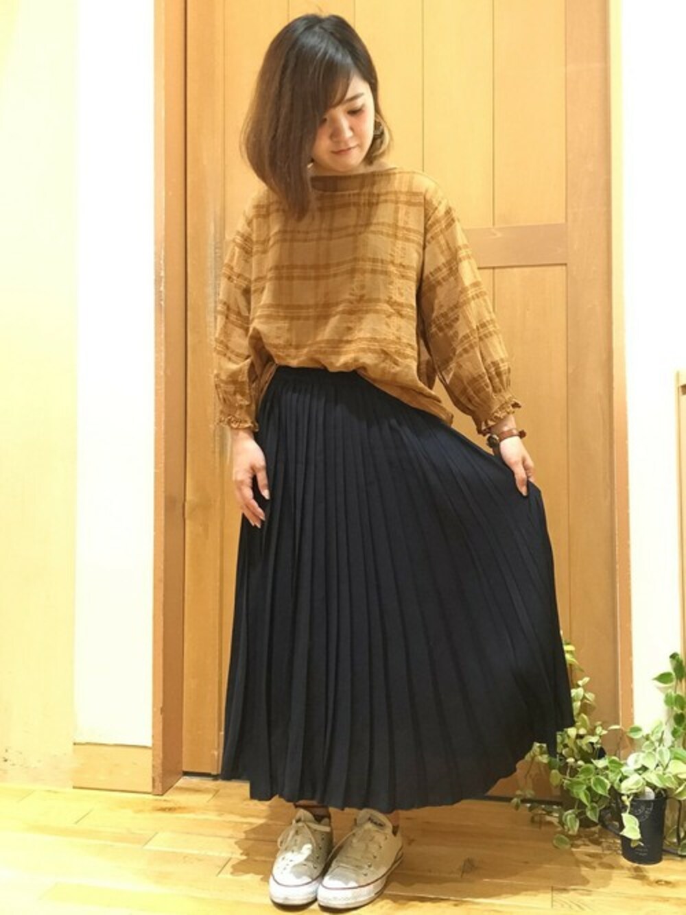 秋色ブラウスを使ったコーディネート。 明るめモカカラーがこれからの季節にピッタリ♪ プリーツスカートを合わせ女性らしいスタイリングになってます、