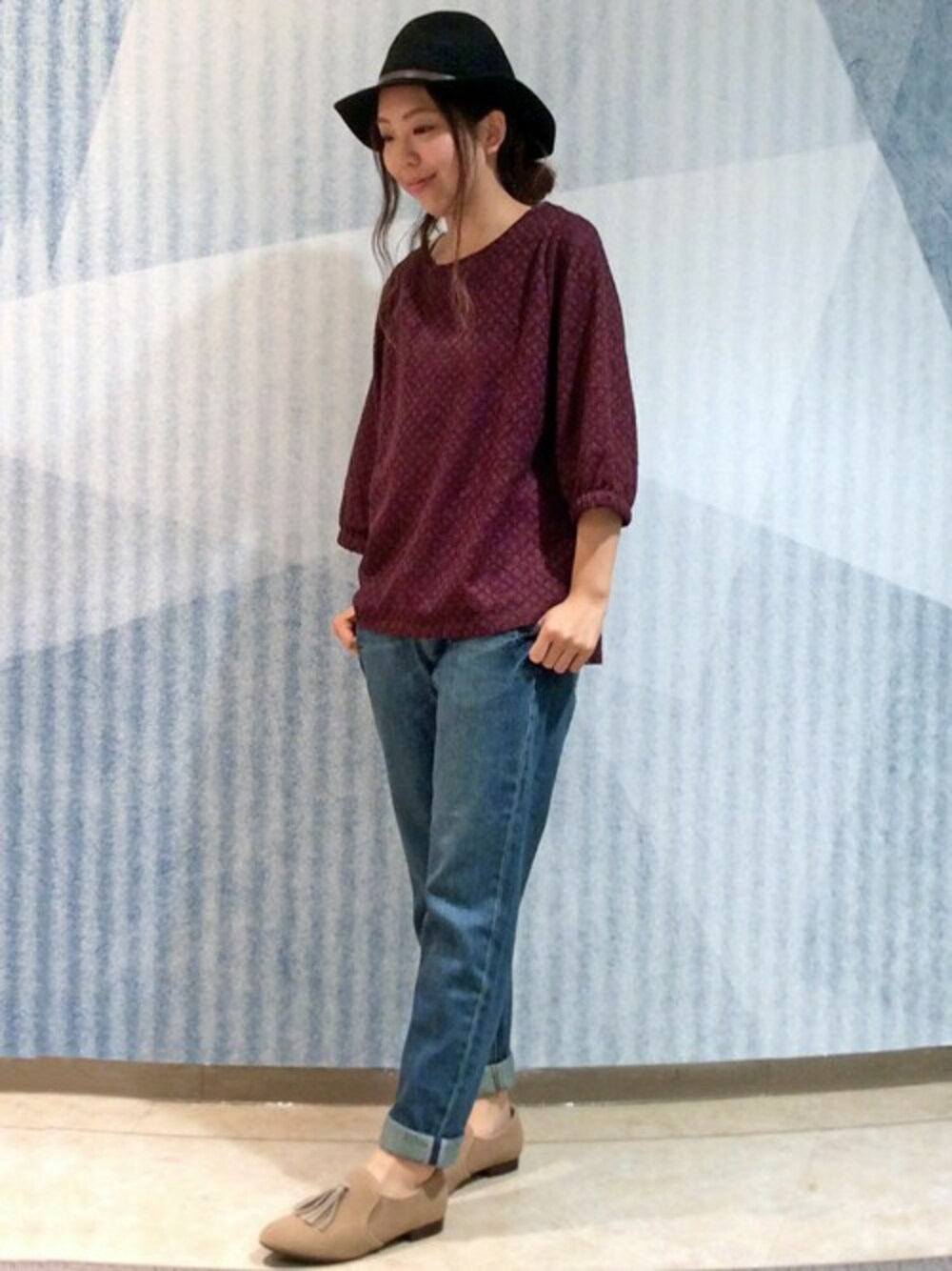 総レースのプルオーバーを使ったコーディネート。 ボルドーカラーが上品な落ち着きのある雰囲気で◎ デニムと合わせカジュアルなスタイリングにしてみました。