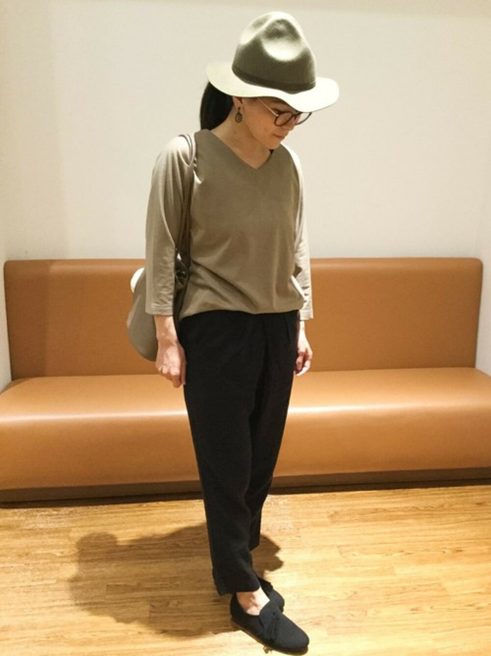 秋色を使ったシンプルコーディネート。 ベージュ×ブラックで落ち着いた雰囲気が◎ フェルトハットやファーのチャーム付きバッグで小物にも秋を取り入れてみました。
