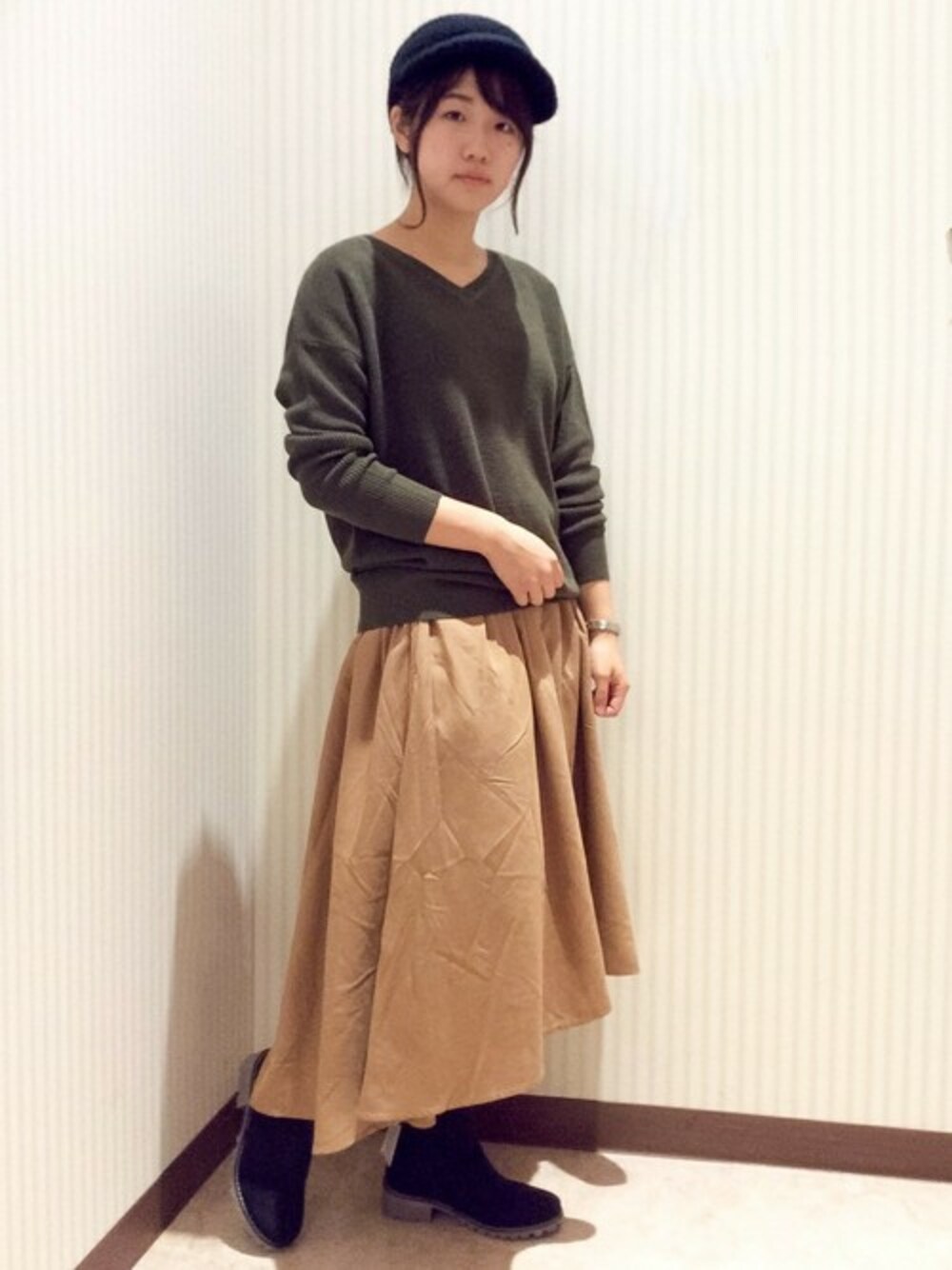 やわらかく、優しい肌触りの素材を使用したVネックのニットプルオーバー。 旬のカーキとブラウンのロング丈スカーで落ち着いた仕上がりに。 シンプルながら、キャップで遊び心を加えてみても◎