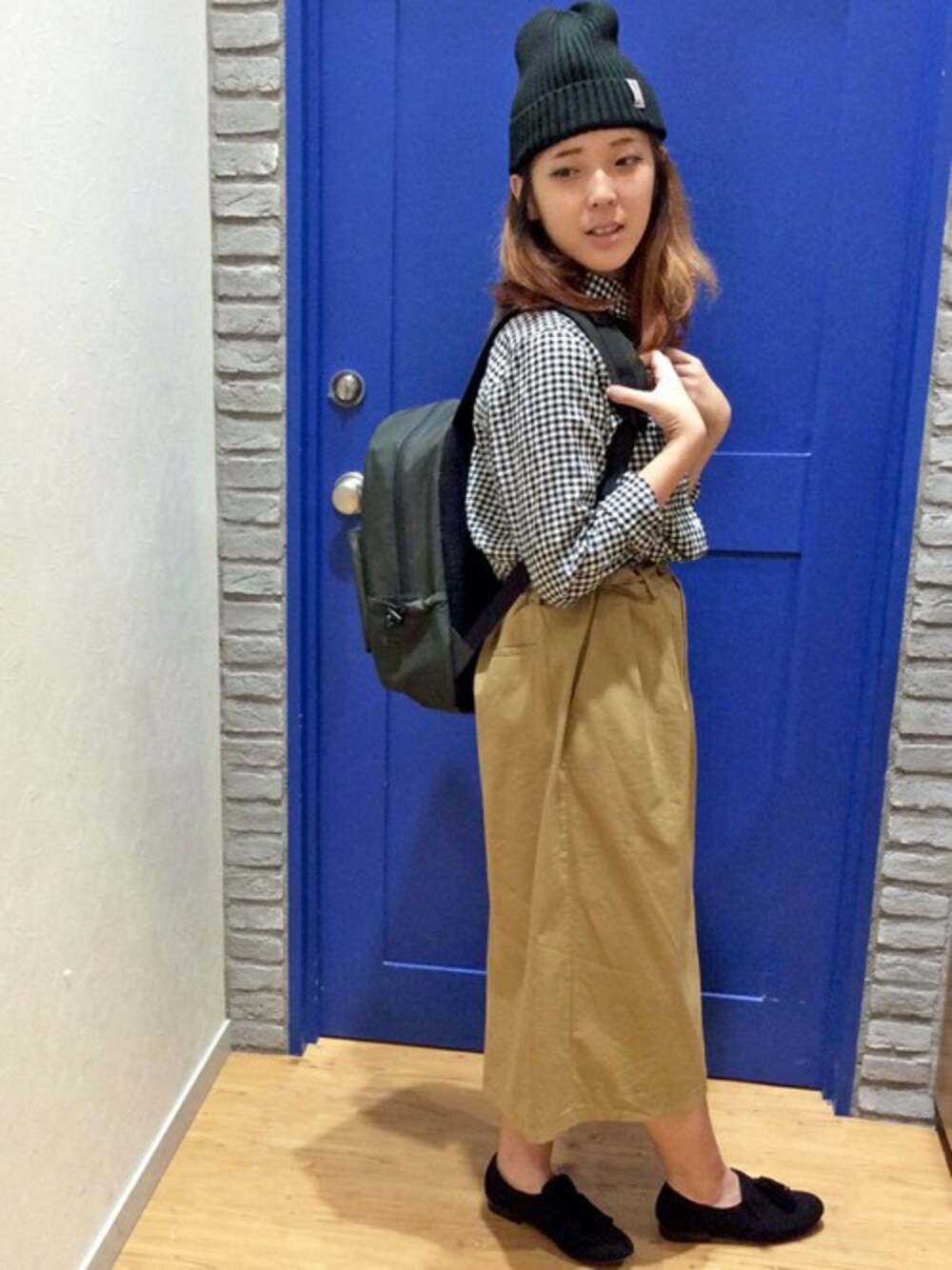 ギンガムチェック柄のシャツを使ったコーディネート。 ベージュカラーのタイトスカートは長めの丈感でバランス◎ ニット帽とリュックでアクティブなお出かけスタイルにしてみました♪
