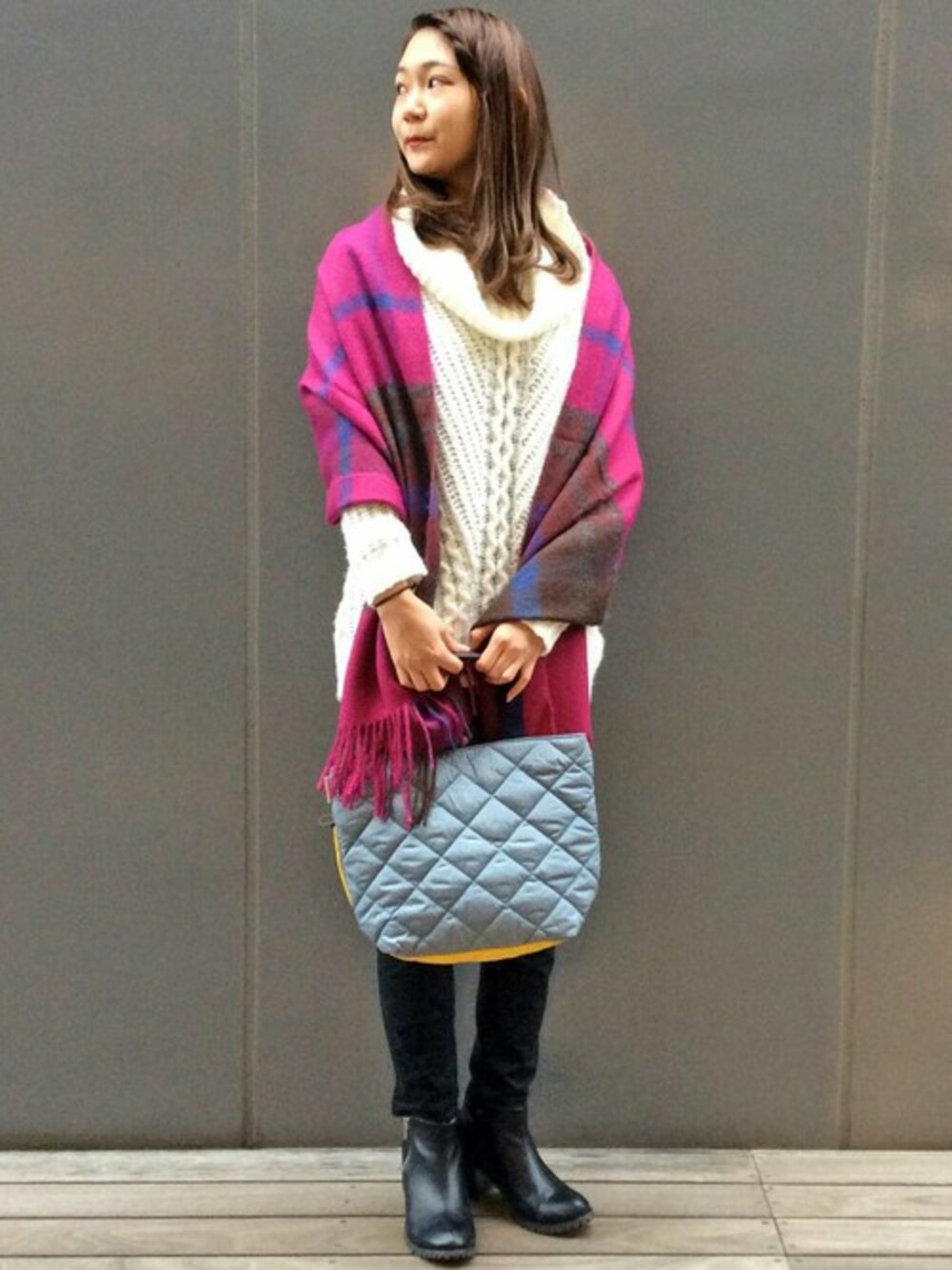 ふわふわタッチの優しい肌触りが心地よいニットプルオーバーは、首元は今年らしいゆるっと感を出すオフタートルのデザイン。 スリムなブラックレギンスに鮮やかなカラーのストールを合わせてカッコイイ感じの可愛さに仕上げました。 表と裏でお色が違うルートートバックで遊び心もプラスして♪