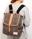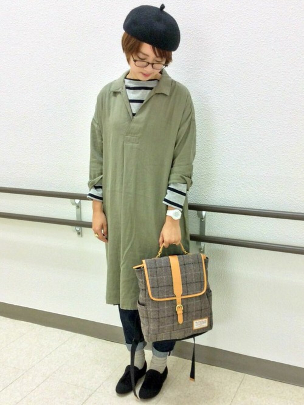 Harris Tweedのリュックがしっくりくるコーディネートです。 秋冬に絶対とりいれたい素材とチェック柄♪ 太めのボーダーにカーキのチェニックで、少しボーイズライクに合わせてみるのがおすすめです。