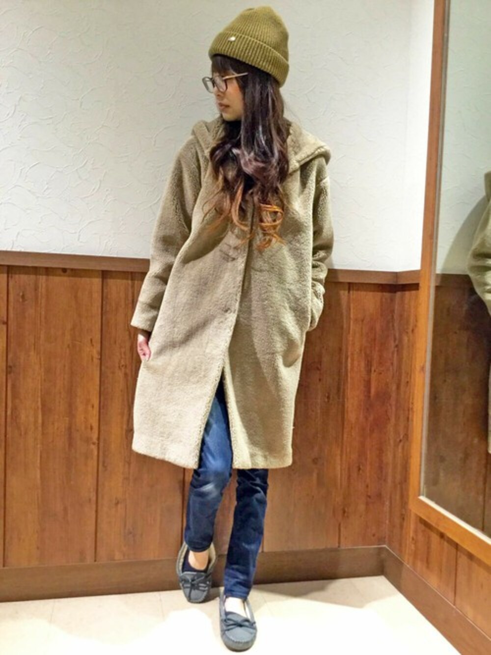 オールボアがかわいいコートスタイル。 心地よい肌触りと包み込まれるようなあたたかさがクセになるボアコート♪ シンプルなデザインなのでカジュアルにもきれいめにも着まわせます。 ニット帽×デニムをあわせれば、休日におすすめのらくちんスタイル完成です♪