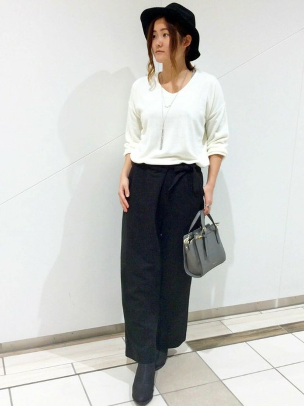 大人の女性らしいモノトーンスタイルです。 首元ゆったりのトップスにラップ風デザインのワイドパンツをあわせました。 程よいゆるさが今年らしい雰囲気です。 コモノには、グレーのバッグを取り入れてアクセントに♪
