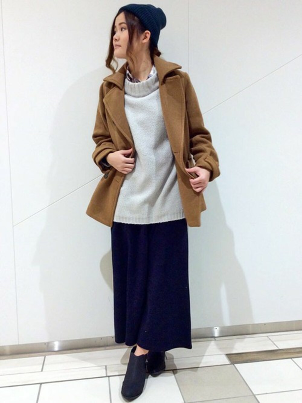 ゆったりとしたシルエットを意識したパンツスタイルに、定番Pコートを羽織ってきちんと感をプラス。 トップスの長めの丈に対して、ボトムは少し短めをセレクト。足首をチラリと見せるのがポイントです。 ニット帽をあわせて全体をカジュアルな印象に仕上げました♪