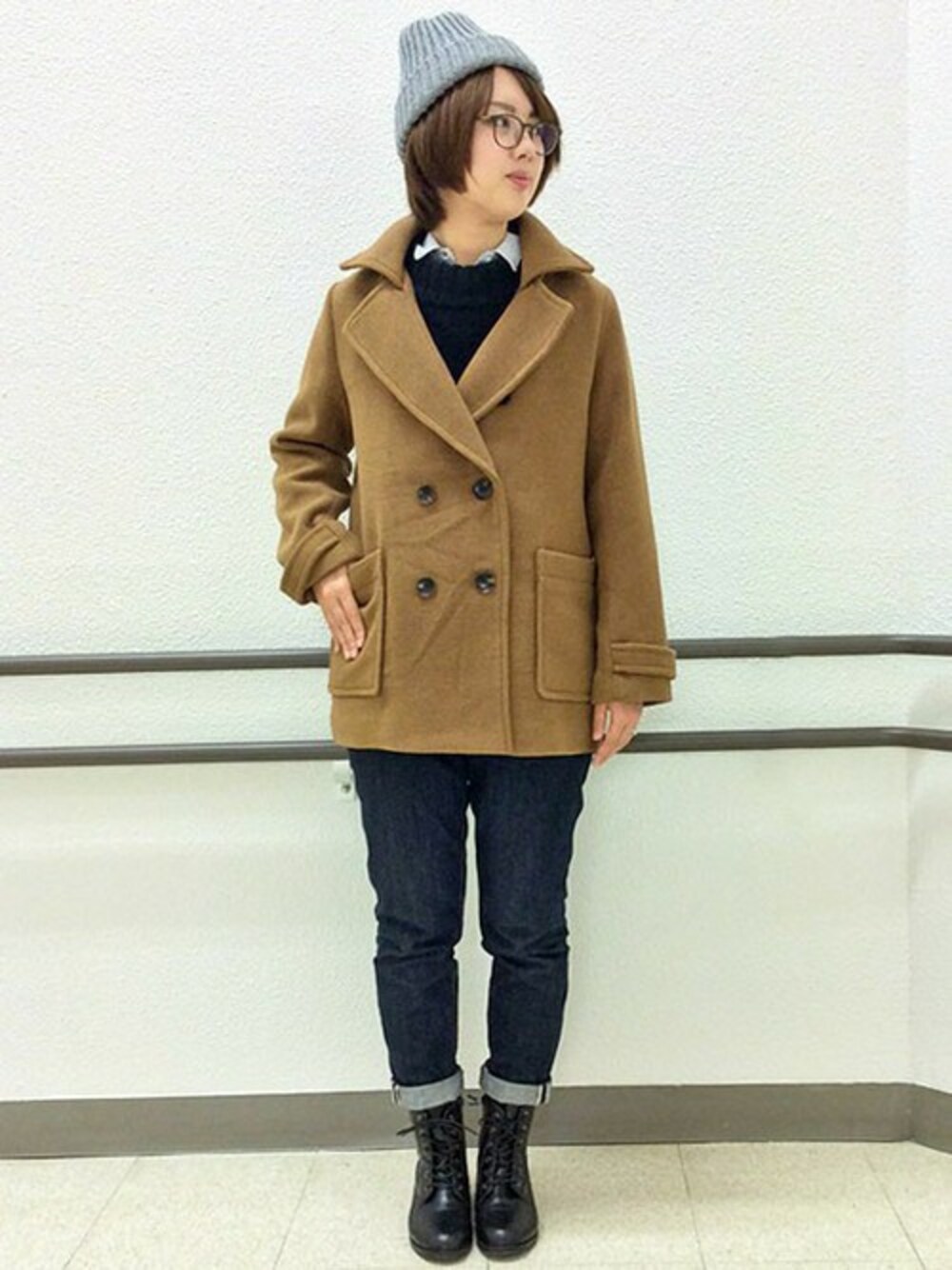 おでかけにおすすめなデニムコーディネート。 シャツ×ベストのレイヤードに定番Pコートをあわせて、メンズライクな印象に仕上げました。 小物もシンプルなニット帽+編み上げブーツでかっこよく♪