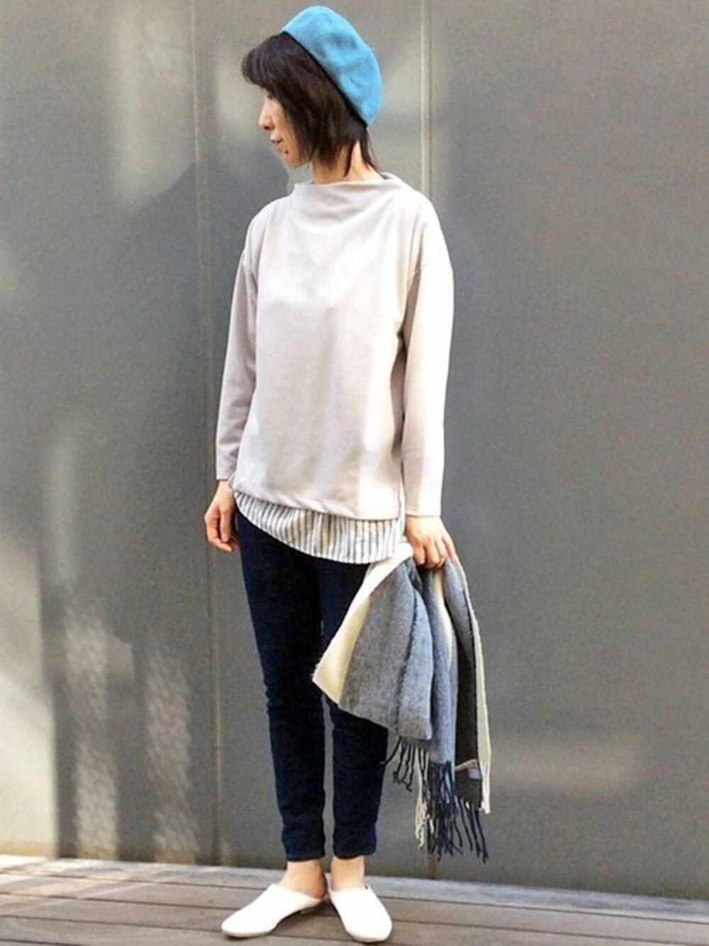 春のすっきりデニムコーデ。 トップスは、裾からストライプ生地を覗かせた、フェイクレイヤードのプルオーバー。 難しいレイヤードをしなくても、一枚でバランス上手になれる実力派アイテムです。 シンプルなスタイリングなので、小物遊びが楽しんで♪