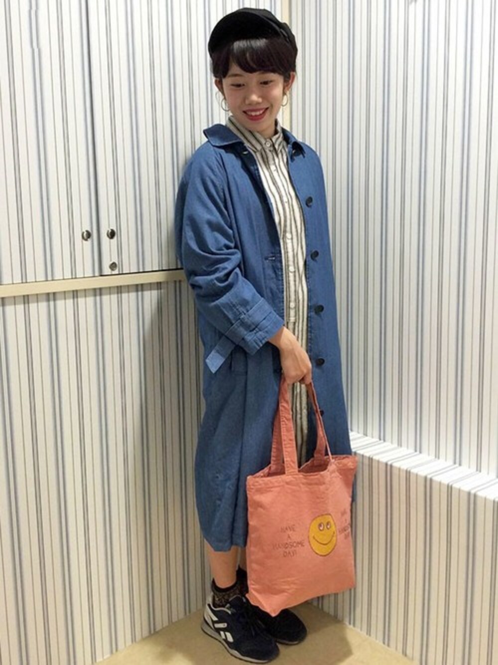 ロング×ロングのレイヤードスタイルです。 人気のショップコートは、デニム素材。裏地についたしっかりとしたつくりで今から春にむけて活躍してくれそうな一枚です。 インにトレンドのストライプ柄ワンピース、クロの小物づかいでメリハリとカジュアル感をプラスしました♪