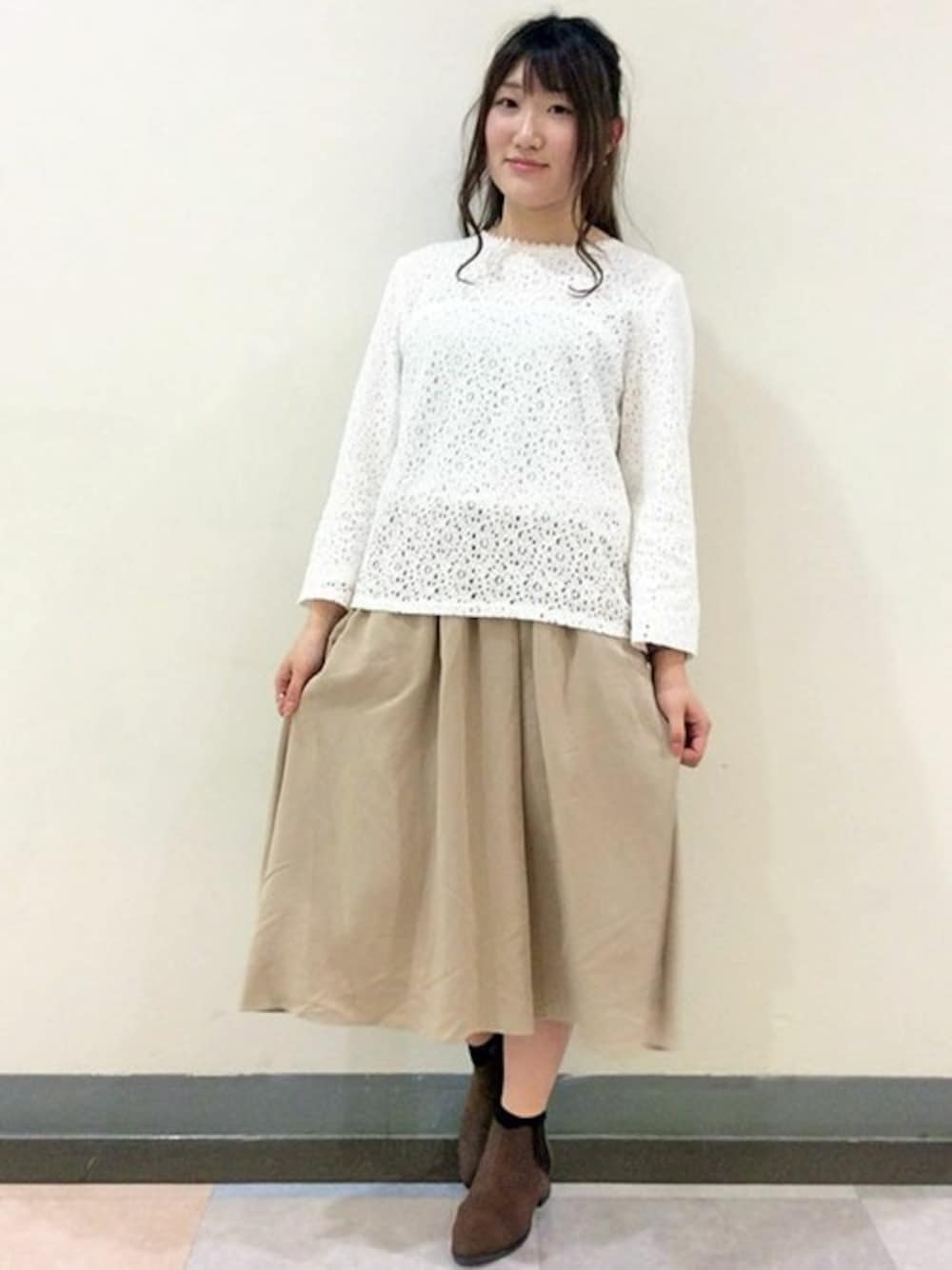 ふんわり優しい雰囲気の女の子スタイル。 丸いお花柄のレースでやわらかな印象になった総レースプルオーバーは、一枚でもアウターのインに着ても華やげる、この時期もってこいな主役トップスです。 今回は、ベージュカラーのギャザースカートをあわせて春らしくまとめました♪