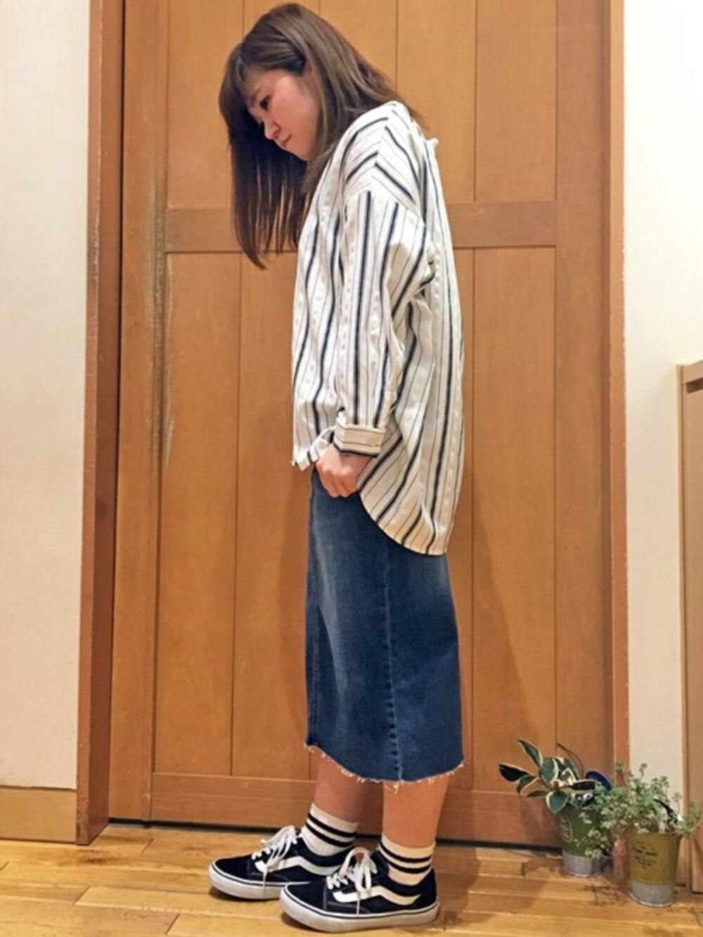 モノトーン×デニムのすっきりコーデ。 季節関係なく使えるデニムスカートは、定番としてワードローブに加えておきたい♪ 裾は切りっぱなし加工でフリンジにすることで、シンプルなトップスを合わせても雰囲気のあるスタイリングに仕上げてくれます。 今回は、落ち感のあるスキッパーシャツをあわせてカジュアル感をすこし押さえてみました。