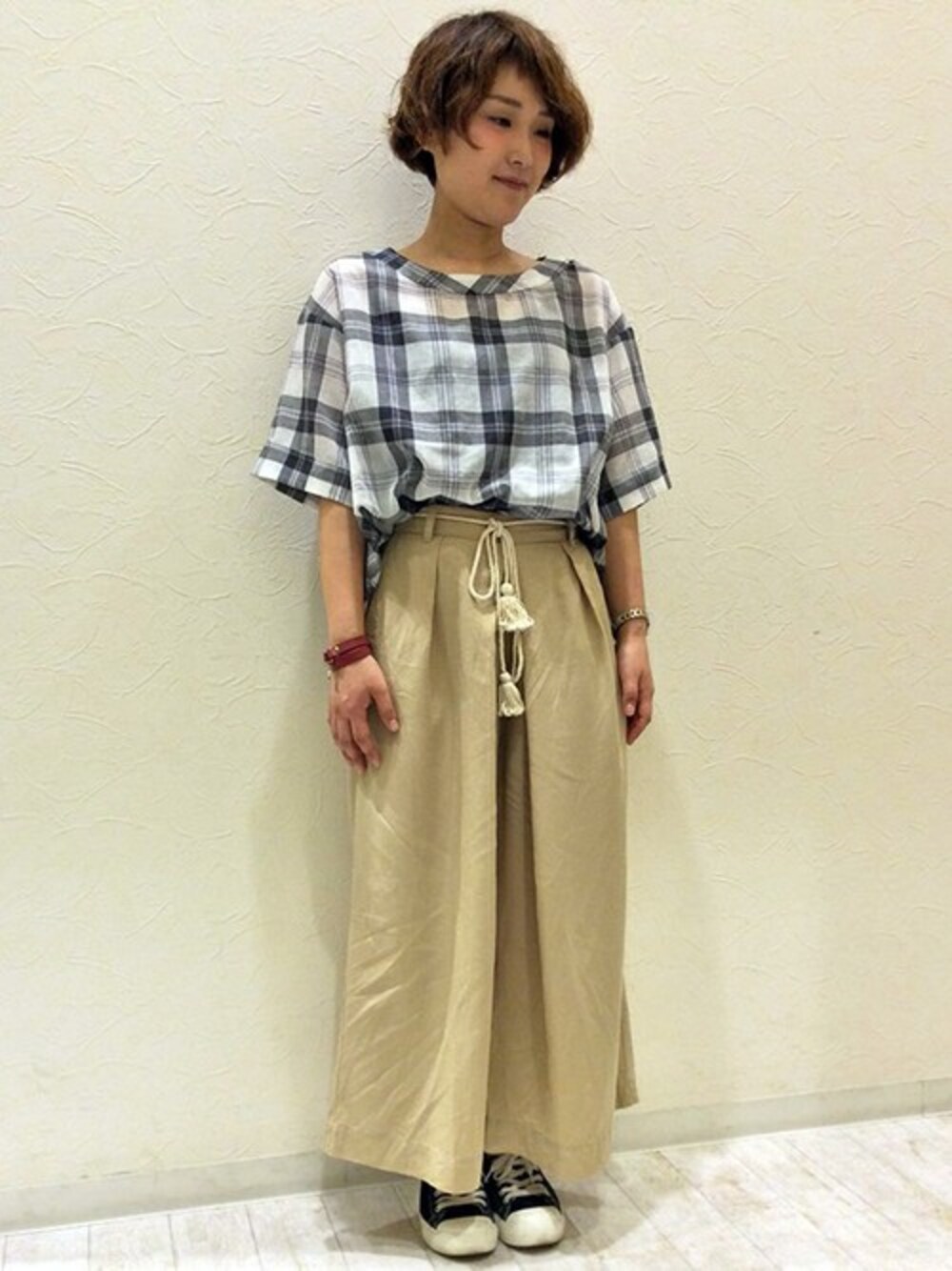 GWのおでかけにおすすめ♪大人カジュアルコーディネートです。 トップスは、ブラウスのきちんと感とTシャツの着やすさを合わせた、使いやすいTシャツブラウス。 今回はボトムスインですっきりとまとめました♪