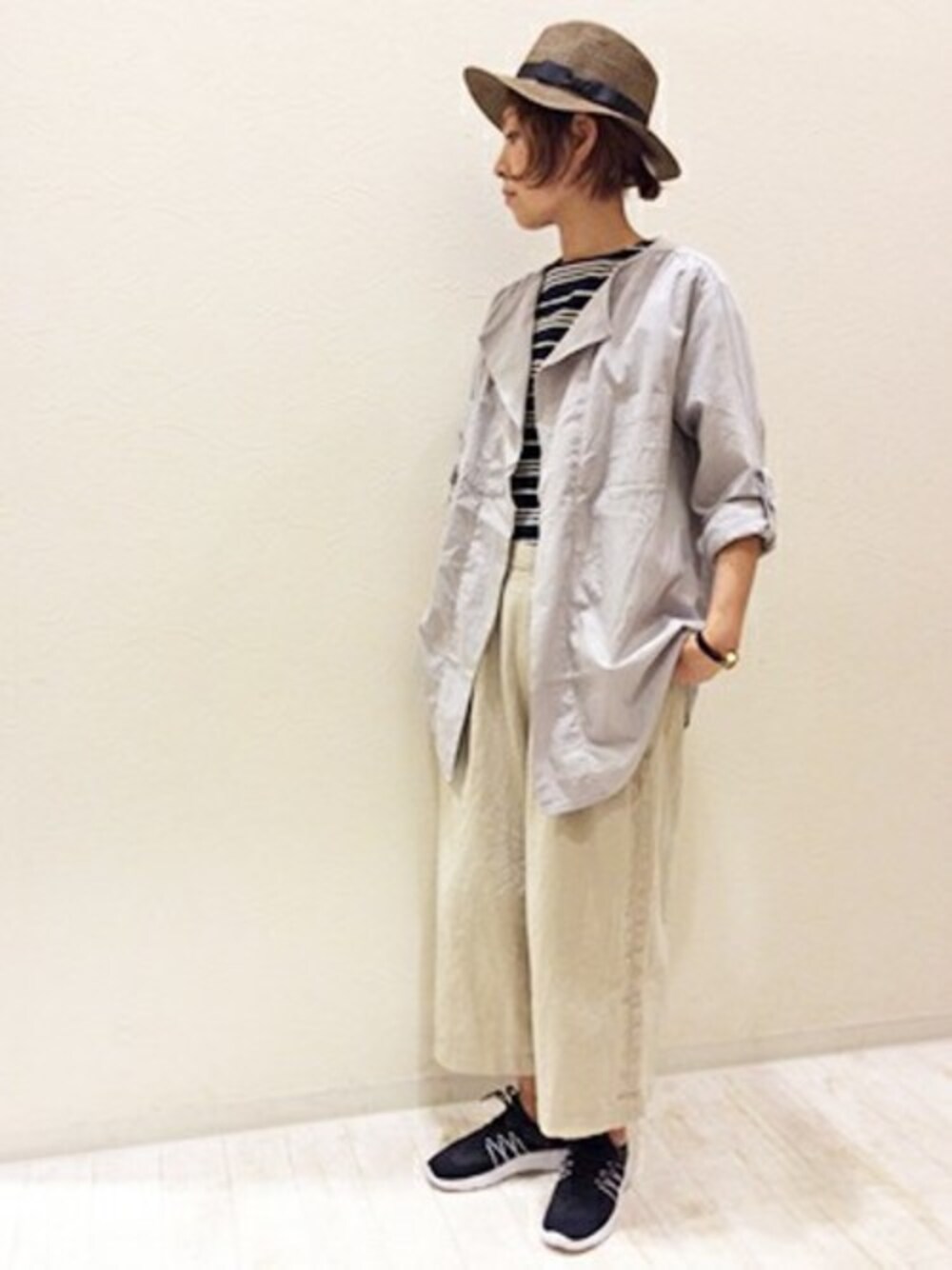 クロをアクセントにしたメンズライクなパンツスタイル。 サファリシャツをベースに、ビッグサイズの羽織りにアレンジしたシャツアウターは、こなれ感抜群の大人な一枚。 Tシャツにさらっと羽織るだけで今年らしい印象にしあがります♪