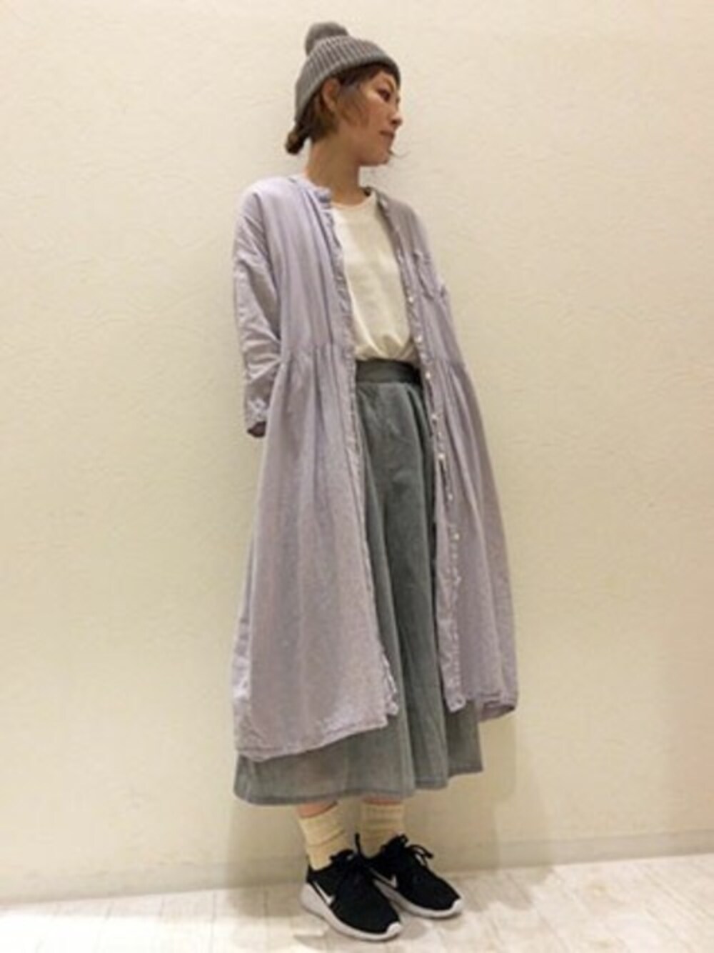 ナチュラル×カジュアルのミックスコーデ。 ふわっと風を通すエアリーなコットンボイルのシャツワンピースは、前を開けて羽織りとして着用するのが今年らしくておすすめ♪ 淡いパープルカラーは涼しげな印象で、さりげないアクセントになってくれます。