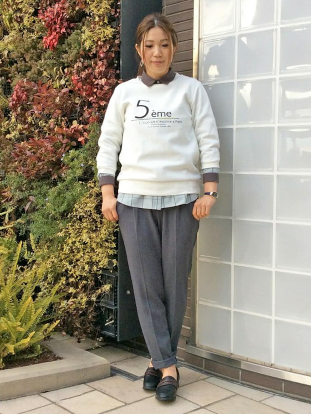 カジュアルな印象のロゴスウェットに、クレリックシャツをインナー使いしたミックスコーデ。 きれいなシルエットのテーパードパンツをローファーを合わせれば、おとななスウェットスタイルの完成♪ スウェットは6分丈が個性的なアイテムです。