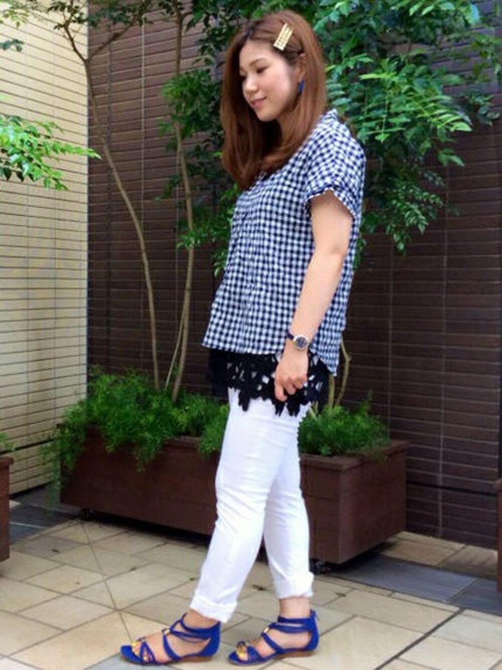 夏らしいギンガムチェック×ホワイトパンツのカジュアルコーディネートです。 トップスは、シワ加工のはいったすっきぱータイプでさらっとした着心地です。 ボトムスは、すっきりとしたスキニータイプ。 裾レースのタンクトップとレイヤードすると女の子らしい雰囲気に♪