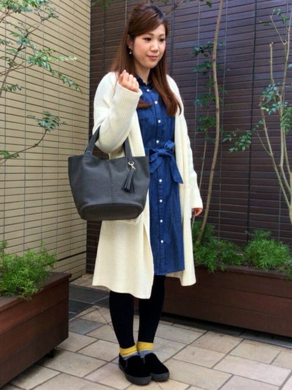 シャツワンピース×ロングカーデのおでかけコーディネートです。 この春注目の素材「デニム」 シャツワンピースなら、一枚着はもちろん羽織としても活躍してくれるので、コーディネートの幅が広がります! 人気の畦編みのロングカーデは、白をあわせて春らしく♪