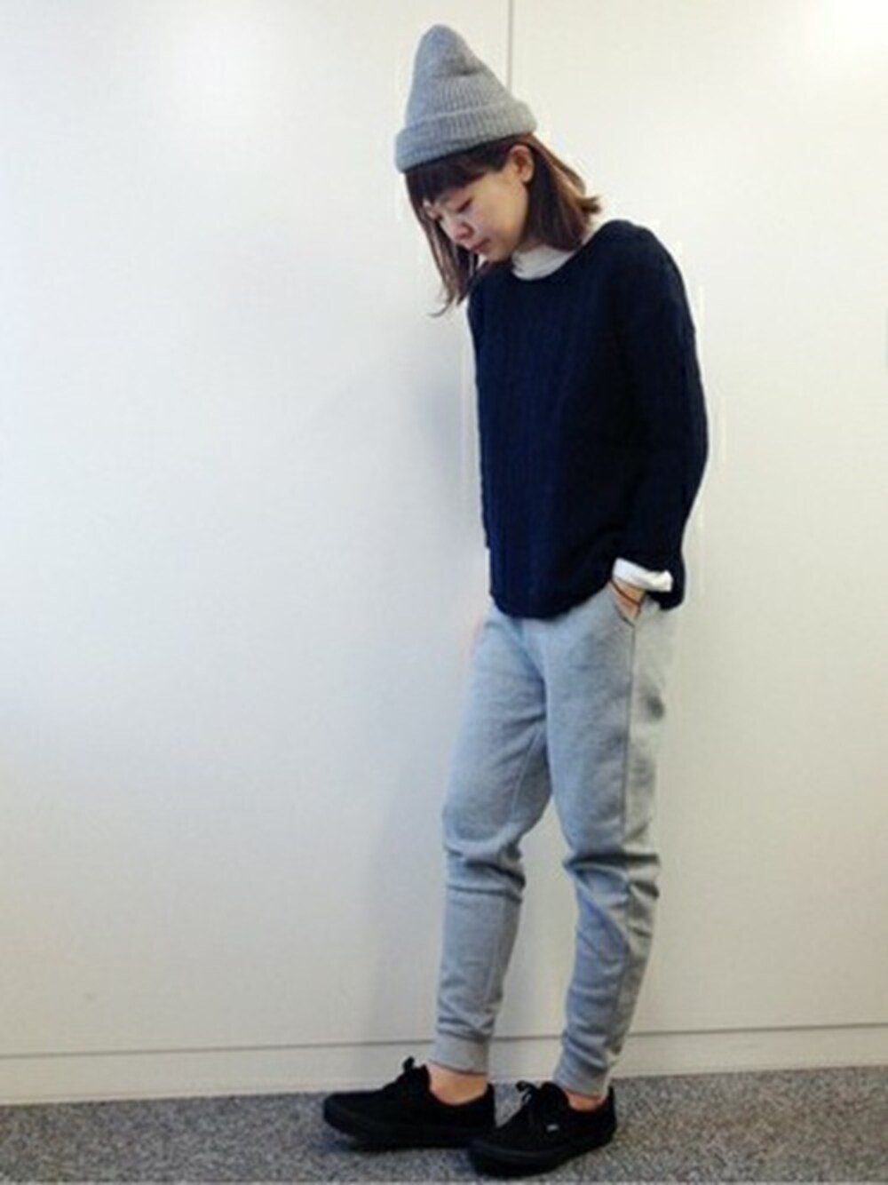 スウェットパンツが主役のコーディネートです。 ちょうどいいダボ感です!作りもしっかり!中は起毛で冬仕様あったか♡ 靴下被せても可愛いですねー! プルオーバーは袖がちょっと短め、丈も少し短めな作りです。 シャツ折り返して出しても可愛いですね! ウールで見た目も作りも暖かいですよ♪