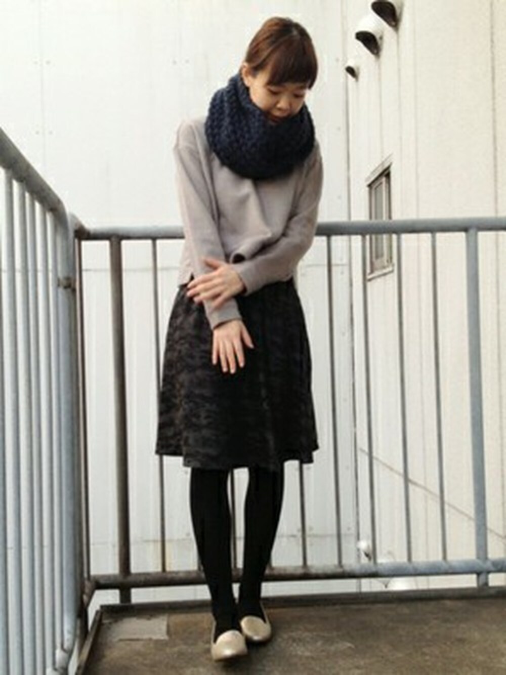 とっても可愛いカモフラスカートが主役のコーディネート。 色もグレーで珍しいです。色味と柄がはっきりしてないところがおススメポイント! そして大活躍のでこぼこストール!ふんわり首元を包んでれます。 すっごい柔らかくて気持ちいいですよ♪