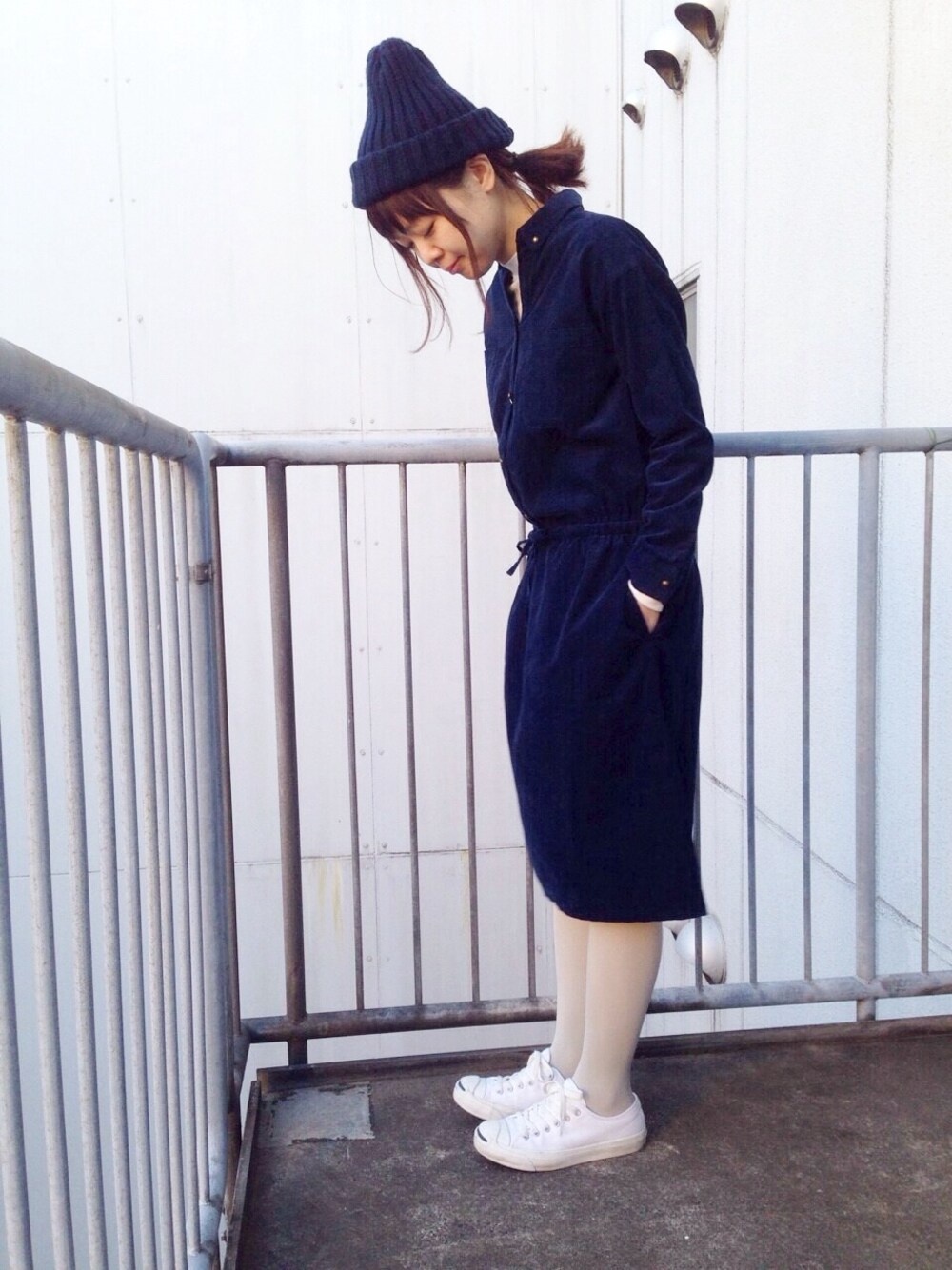 1枚で可愛いコーデュロイのワンピース ネイビーとホワイトでシンプルに。