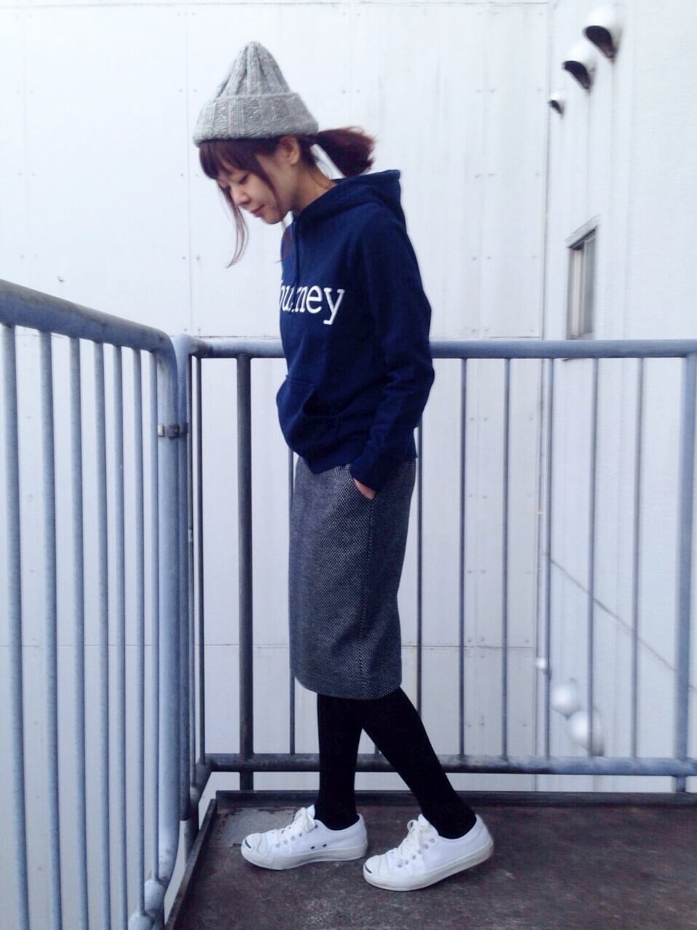 パーカーにはバランスを取って タイトスカートでかわいらしく♪