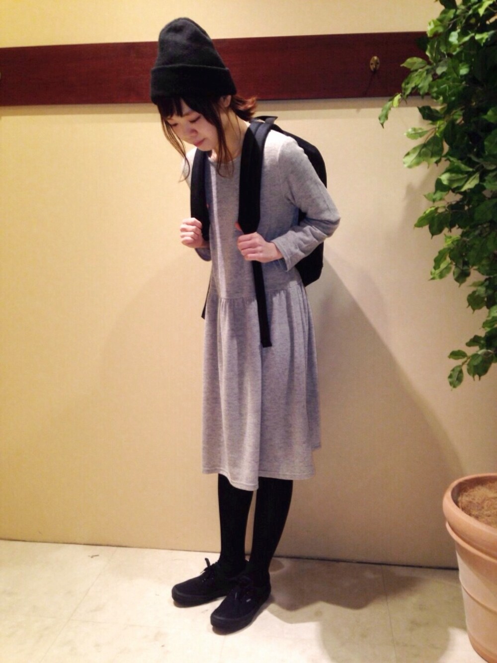 ふんわり温かみのあるワンピースに 黒小物でボーイッシュに。