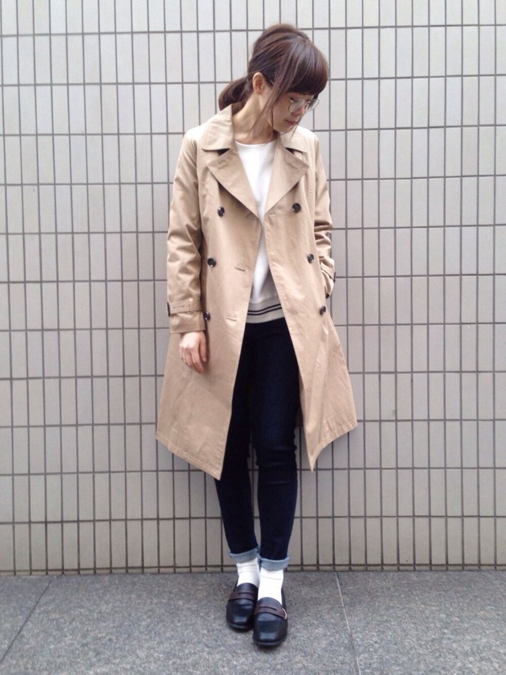 キレイ目トレンチを崩さないよう スキニーにローファー合わせで英国風に。 メガネもポイントです。