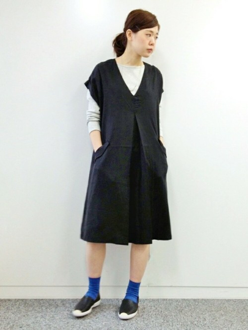 ゆるっと落ち感のある 着れインワンピースに 邪魔をしない同色のスリッポン。 でも靴下で遊び心を効かせて★