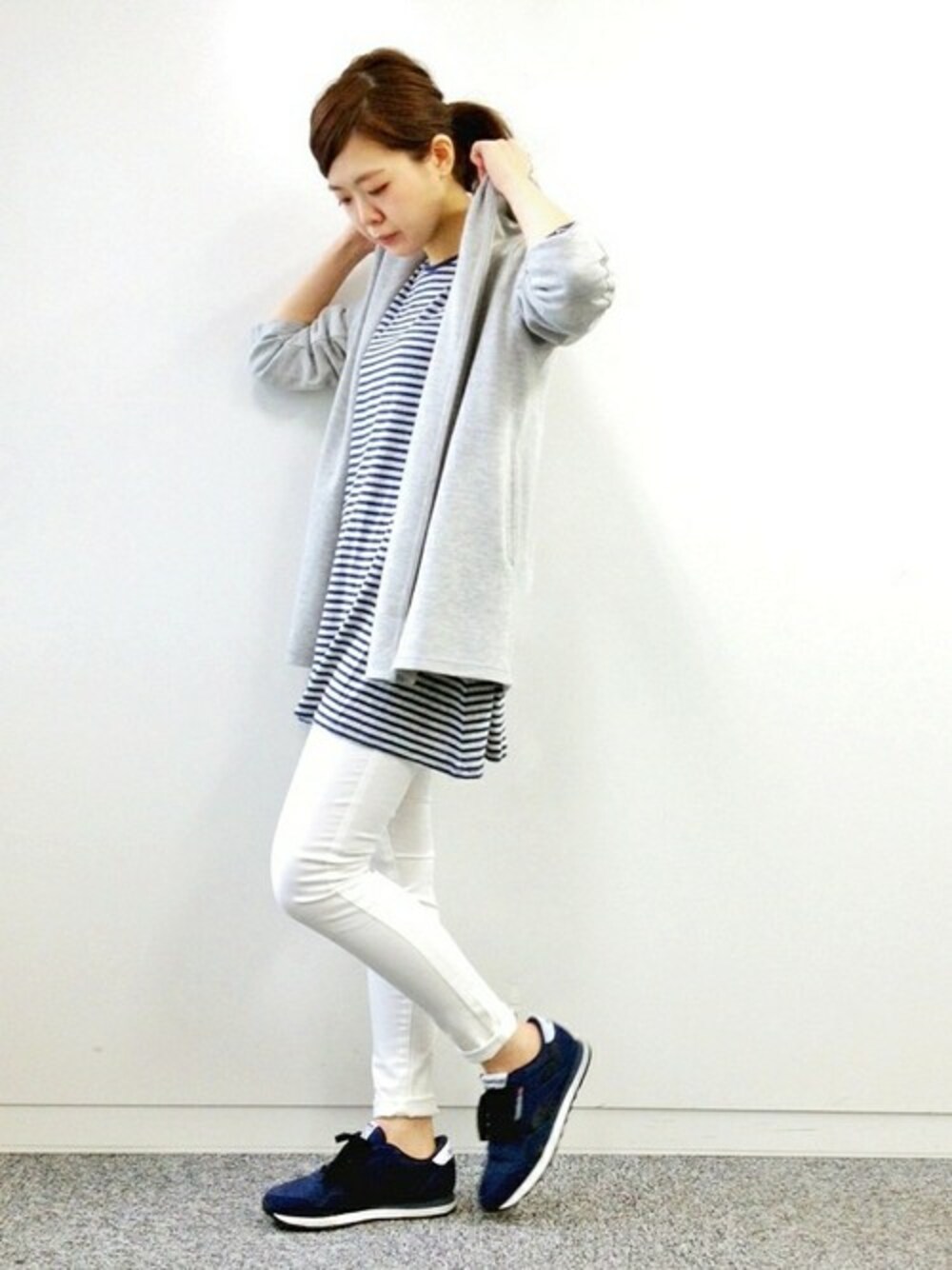 着心地の良いロングカットソーに さらっとトッパーカーデを羽織って シンプルカジュアルスタイリング。 足元はスニーカーで軽さを!