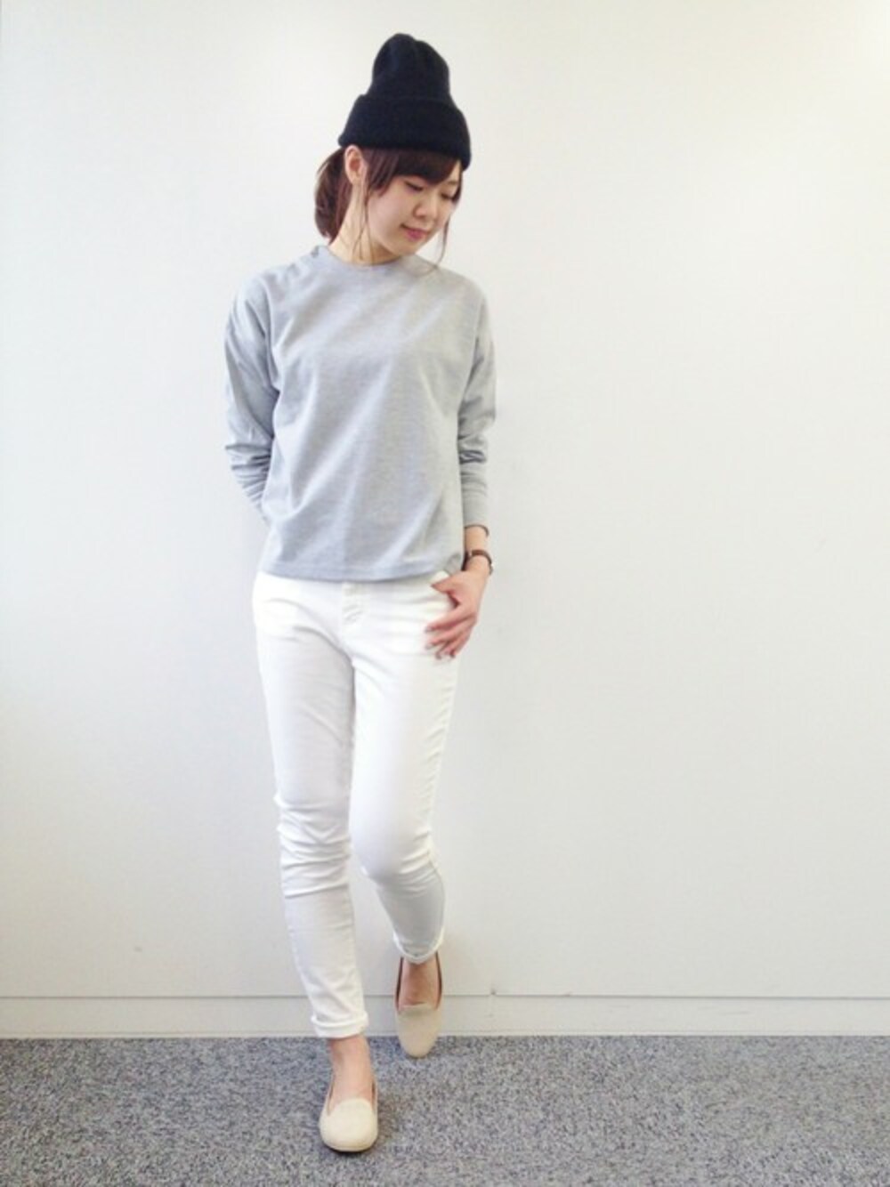 形の良いシンプルなプルオーバーは 右肩にZIP付です。 白スキニーを合わせてスッキリシンプルに。
