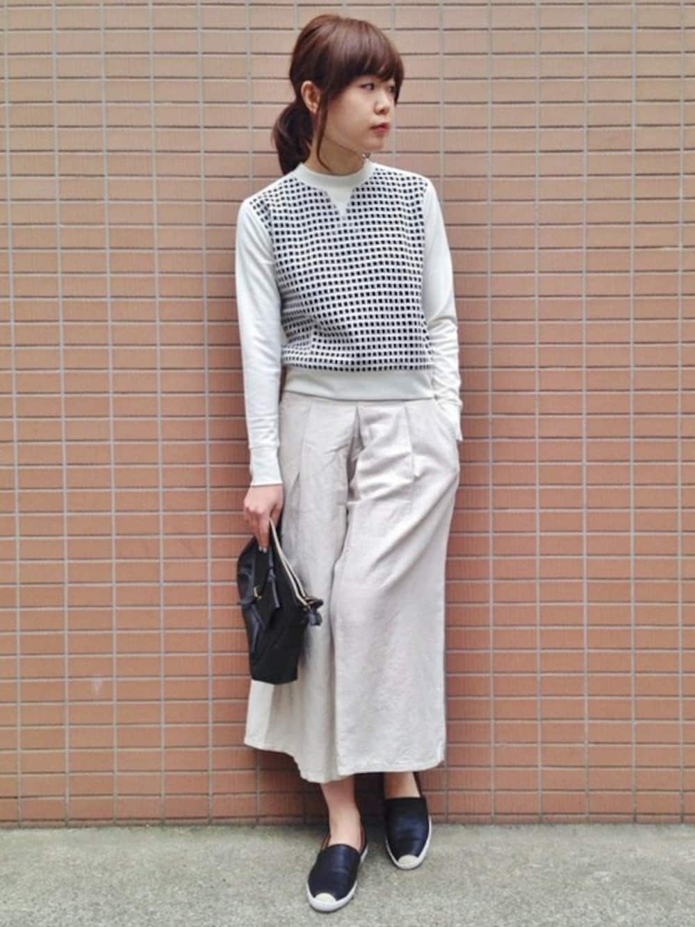 1枚でサマになるプルオーバーは ぴったり目のサイズ感なので、 ワイドパンツで差をつけて女性らしさを♪