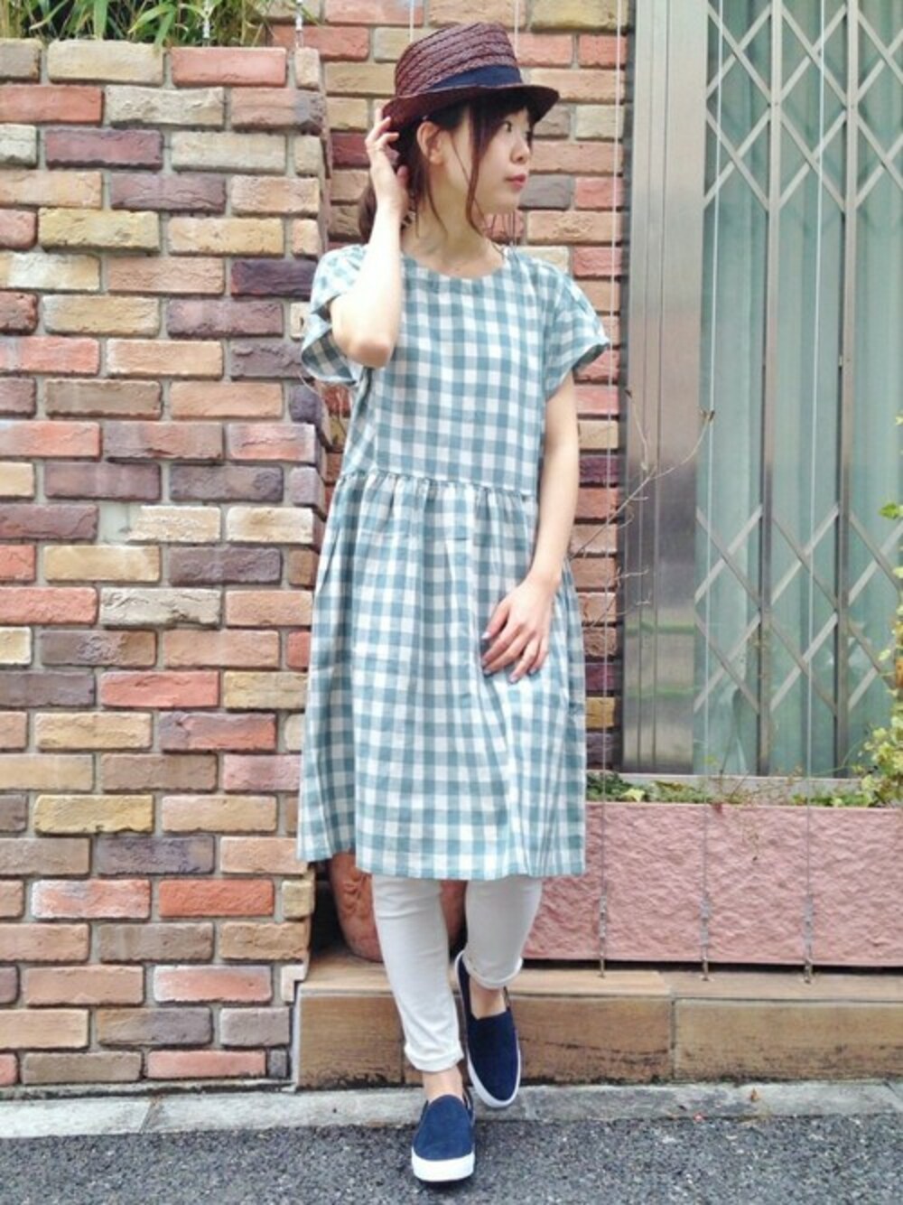 淡いグリーンが春らしいワンピース。 ギンガムチェックは今季のトレンド! 白パンを合わせてクリーンに(^O^)