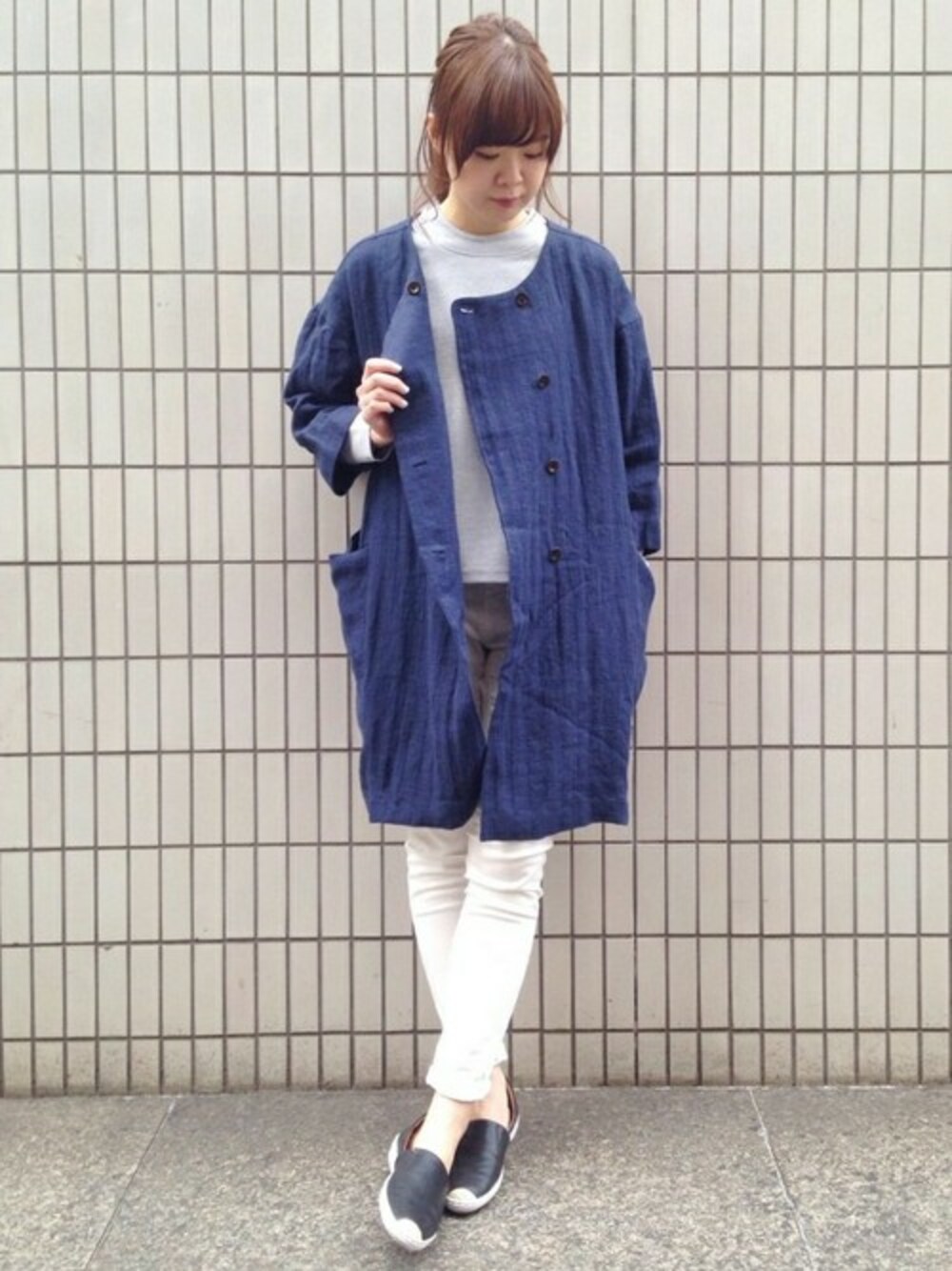へリンボンワッシャーという素材で 表情ある風合いが魅力のコート。 カジュアルな印象の生地感やシルエットですが、ダブルボタンできちんと感もあります♪ 1枚でサマになるスプリングコートです(^O^)