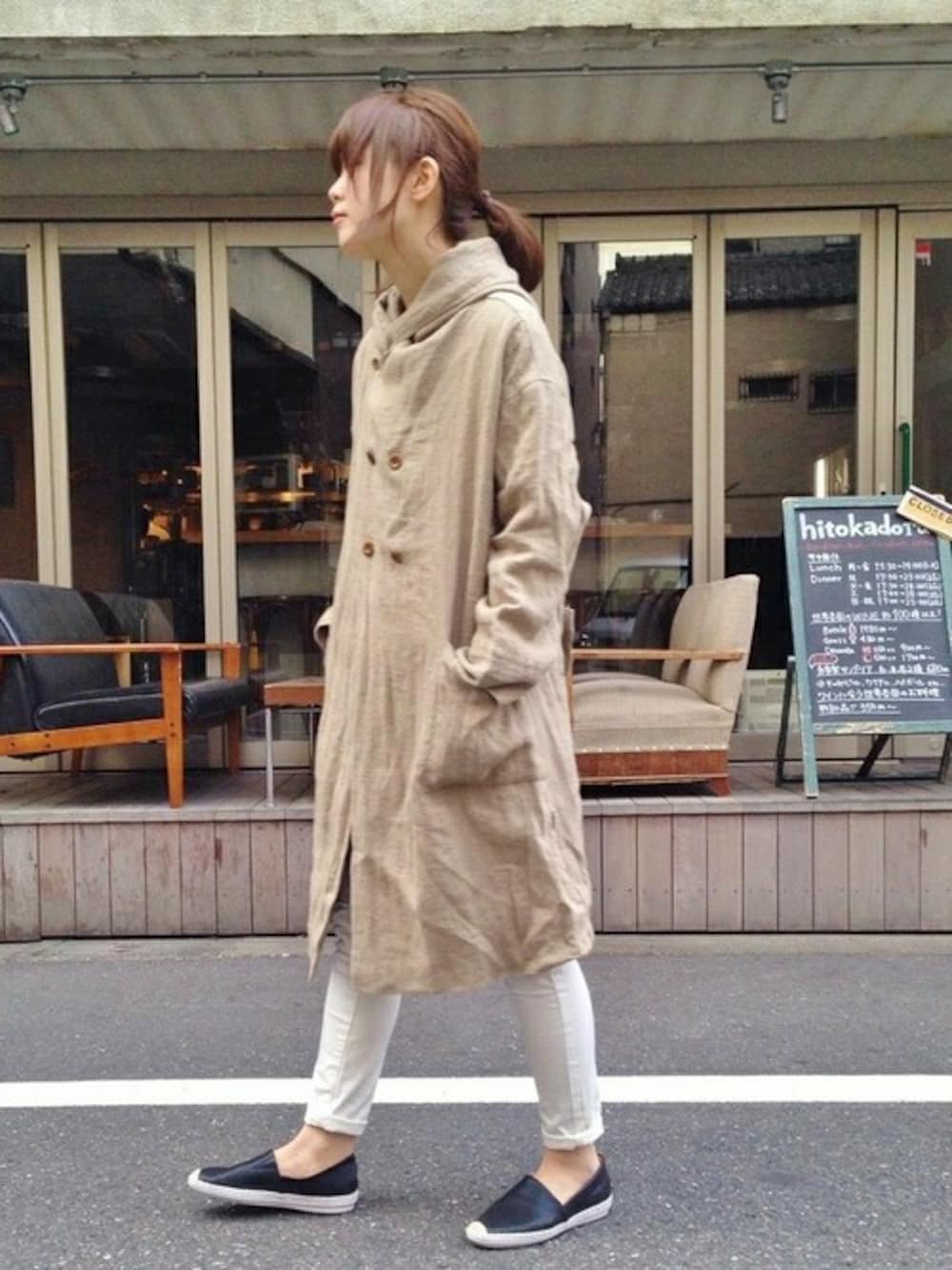 おかだのその他アウター「【BB】リネンへリンボンフードロングコート」を使ったコーディネート