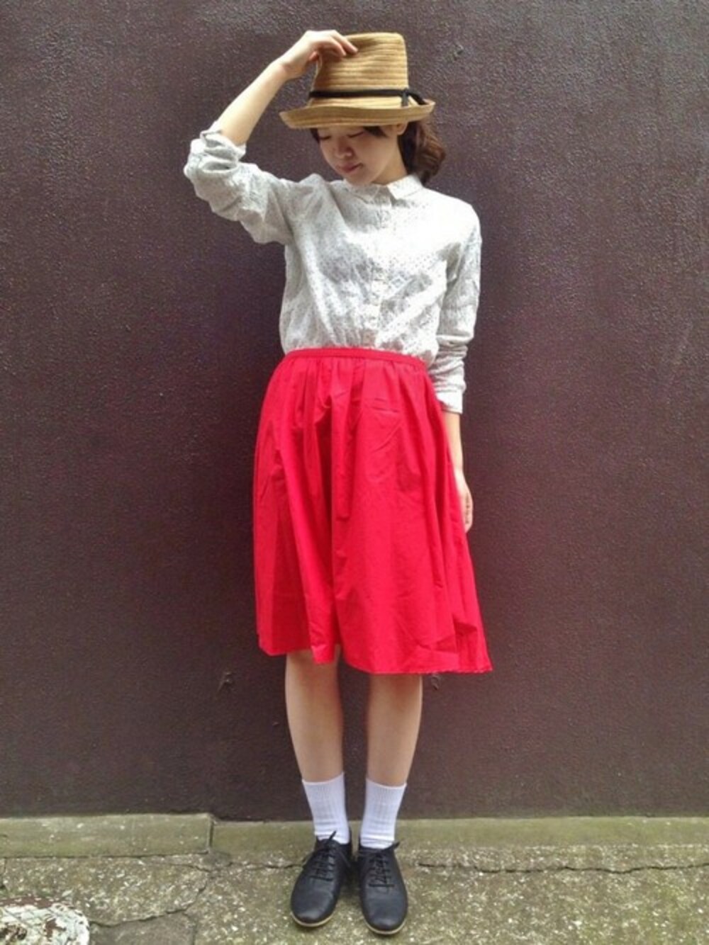目を引く鮮やかレッドが可愛いスカートに ドットのシャツ、ハットで涼しげに(^_^) リンネル5月号登載商品です♪