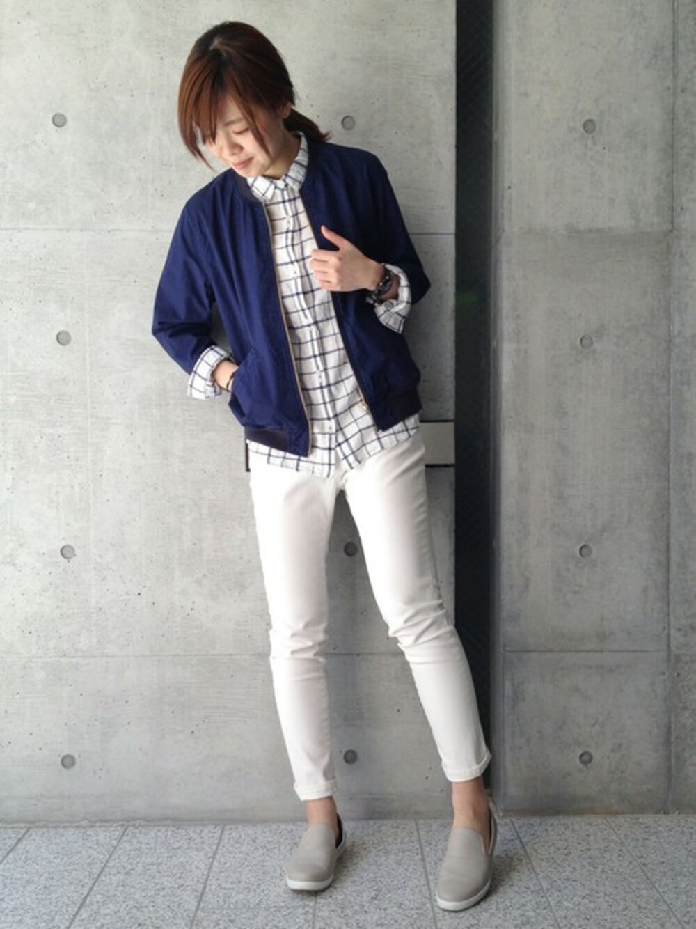 ネイビーのシンプルなブルゾンに 同色ネイビーとホワイトをくみあわせて とことん爽やかに軽めに。
