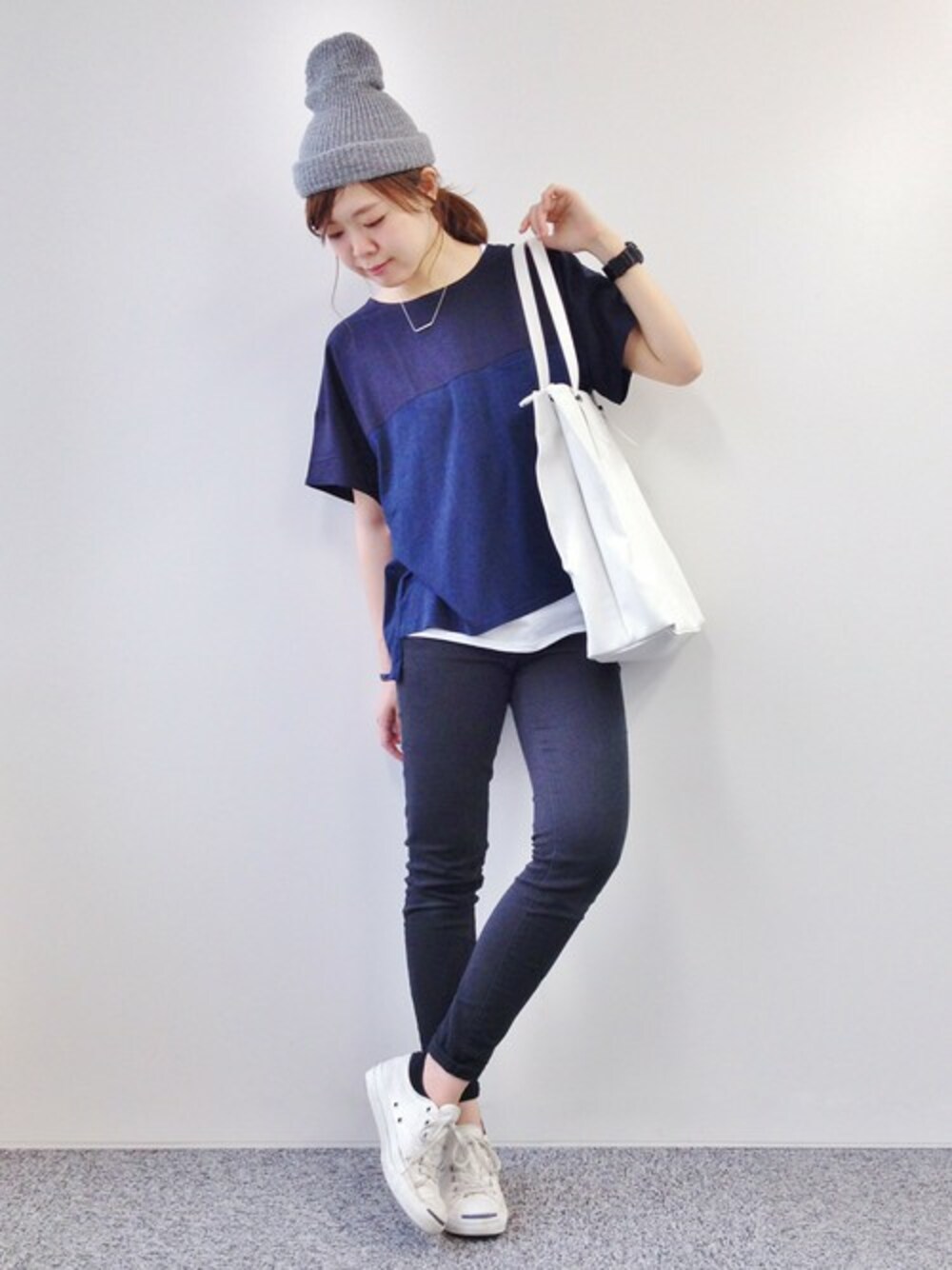 新作トップスがめちゃくちゃ可愛い。 おかだ一目ぼれアイテムです!!!(゜o゜)♥ サイズ大き目、後ろが長め。 胸から切り替えになっていて、 上が布帛、下がコットン! これは絶対スキニーを合わせたくなりました。笑 ネイビーに黒、白。 おかだ大好きコーデです。にやり