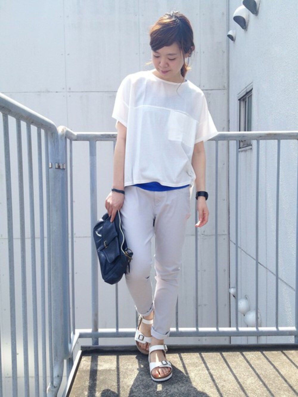 白×ライトグレーの軽快な色の組み合わせに インナーのブルーを見せてポイントを! 足元もサンダルで、ラフな雰囲気に。 新作レギンスパンツはとっっても伸びる! 足に吸い付くような履き心地です♥