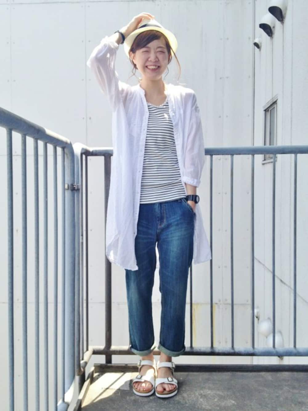 デニム、ホワイト、ボーダーで THE 夏スタイル! ペーパーハットも被って更に夏らしく★ 海に行きたいコーデ(^_^)♪