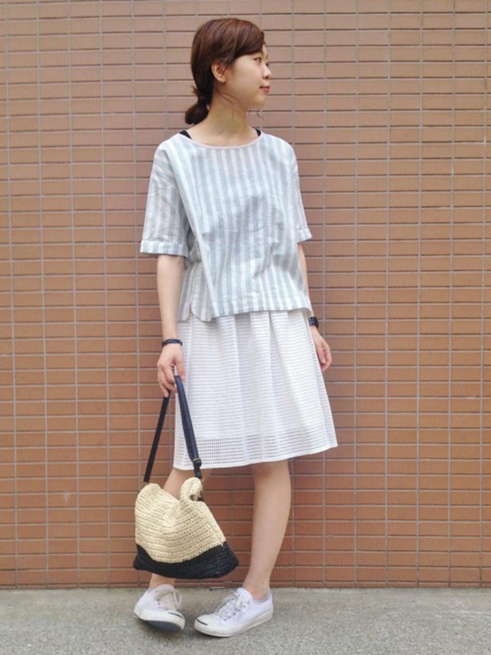 新作ブラウスが可愛い!!!♥ 水色と白のストライプでとっても可愛いので そのイメージのままに白いスカートを合わせてとことんガーリーに! スカートはメッシュ素材なので、 程良くスポーティーさも出してくれます♪